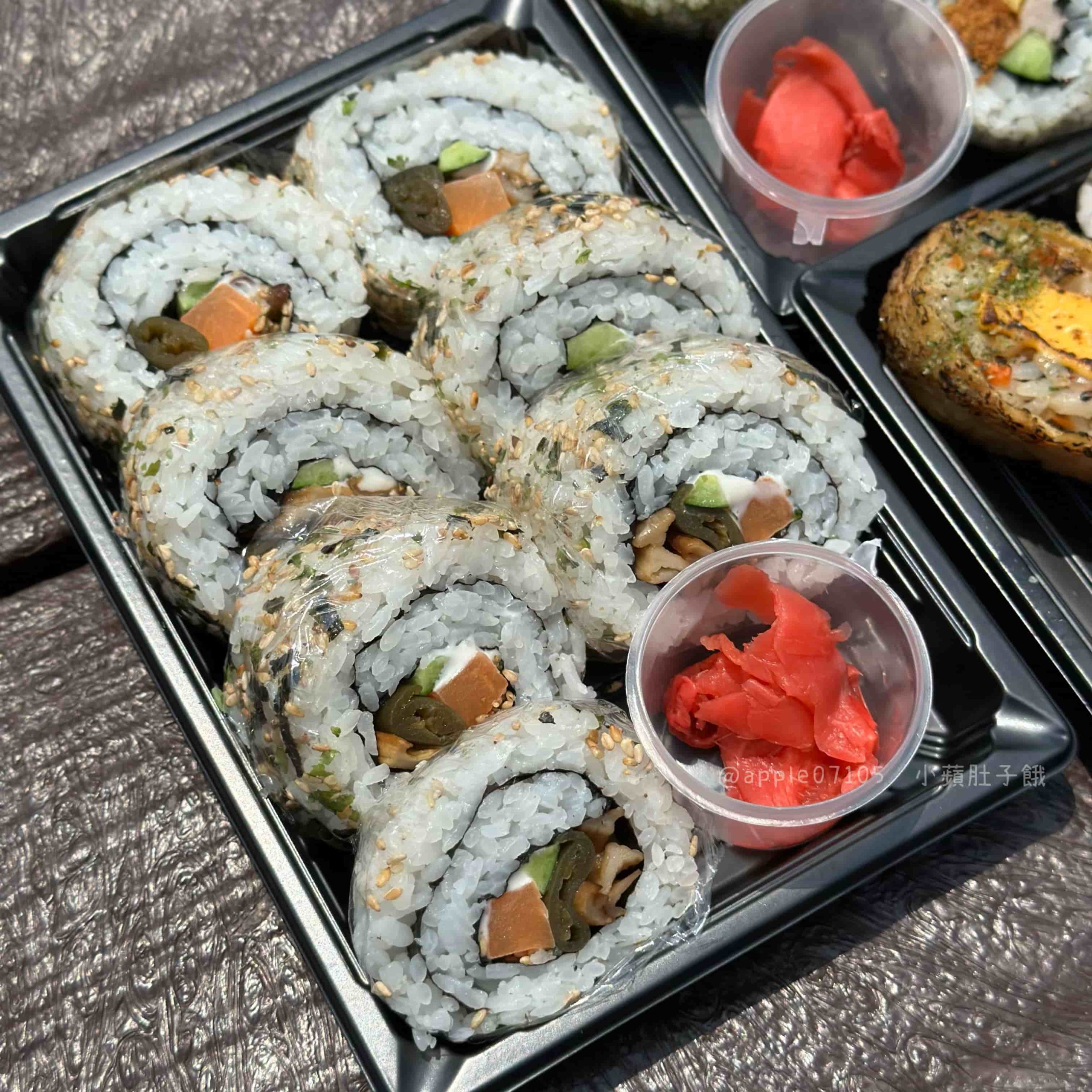 剝皮辣椒壽司,這款讓我很驚艷而且是全素可吃!一吃就有濃郁剝皮辣椒香帶刺激辣感,又有紅蘿蔔、黃瓜增加清爽感,最特別是還有包炸過的杏鮑菇多了一點Q脆感也很好吃是屬於重口味壽司!而且我自己會怕紅蘿蔔的生味,但他們家的紅蘿蔔脆口卻都不會有生味,反而是清爽不搶戲很融合~這樣的搭配紅蘿蔔我可以多吃好幾個🤤