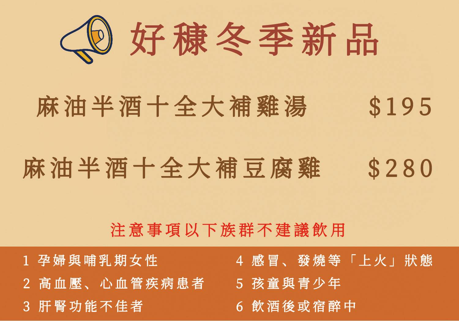 這個冬天新推出了麻油半酒十全大補系列!因為米酒加得多,所以大家要留意一下是不是可以喝的狀態唷