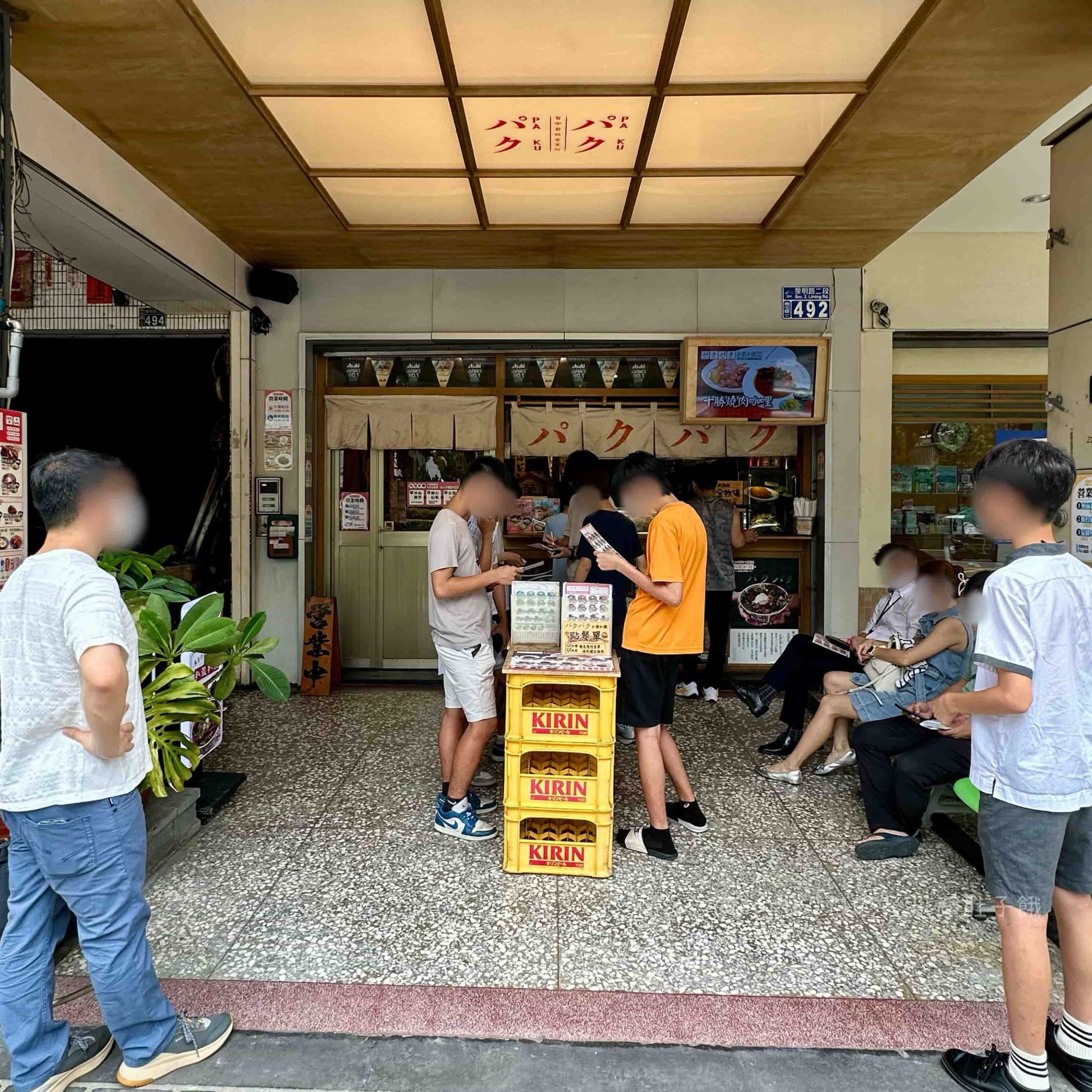 店門口就可以感受到日式風格,加上印有パクパク的布簾,還有用啤酒箱擺成小桌子,讓候位的客人可以先看看菜單~我們這天是平日來吃,中午用餐時間就有很多人在門口等候內用或是外帶