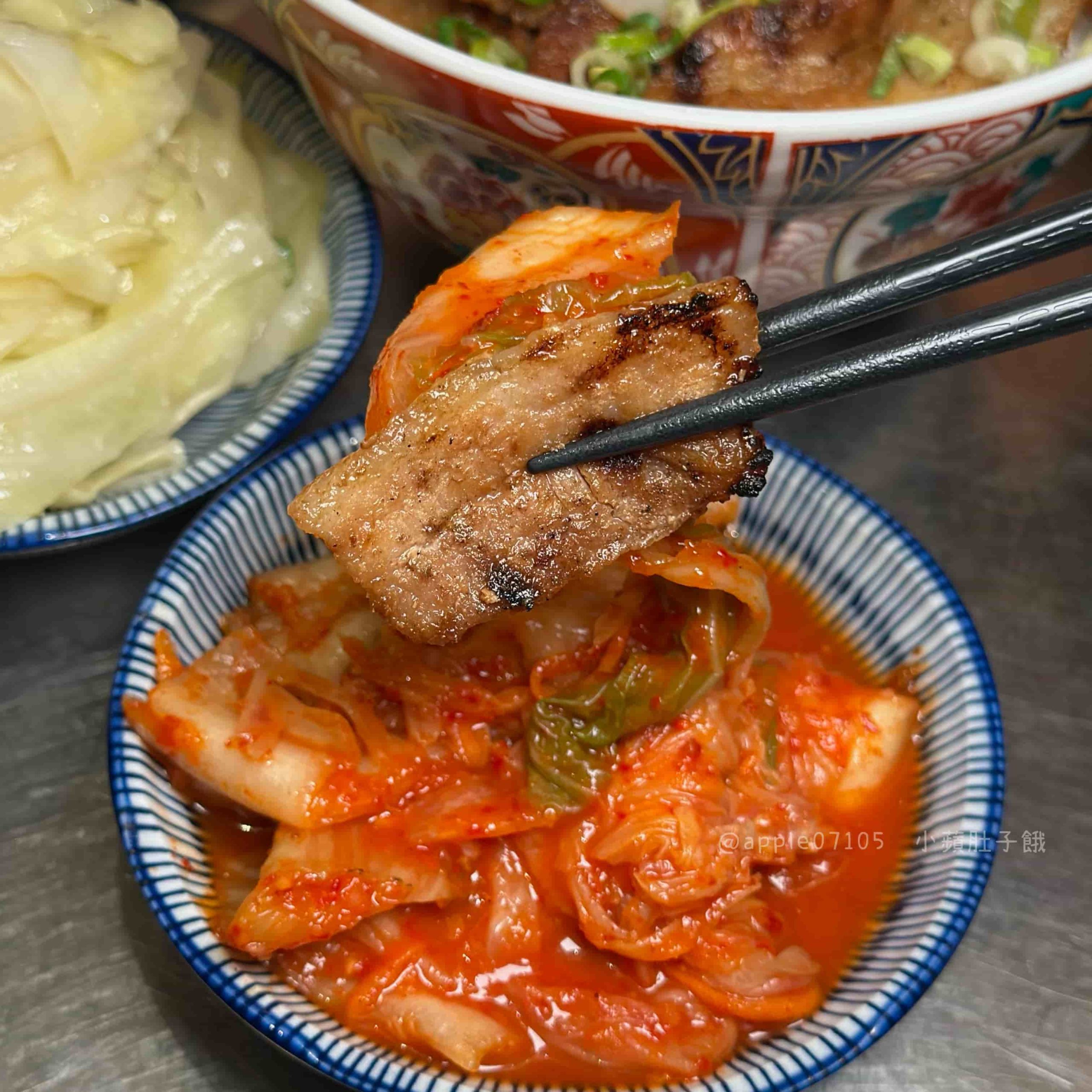 滿滿的五花肉片鋪滿整個碗,色澤帶著直火燒烤的焦香,還有醃製的柚香蘿蔔片!