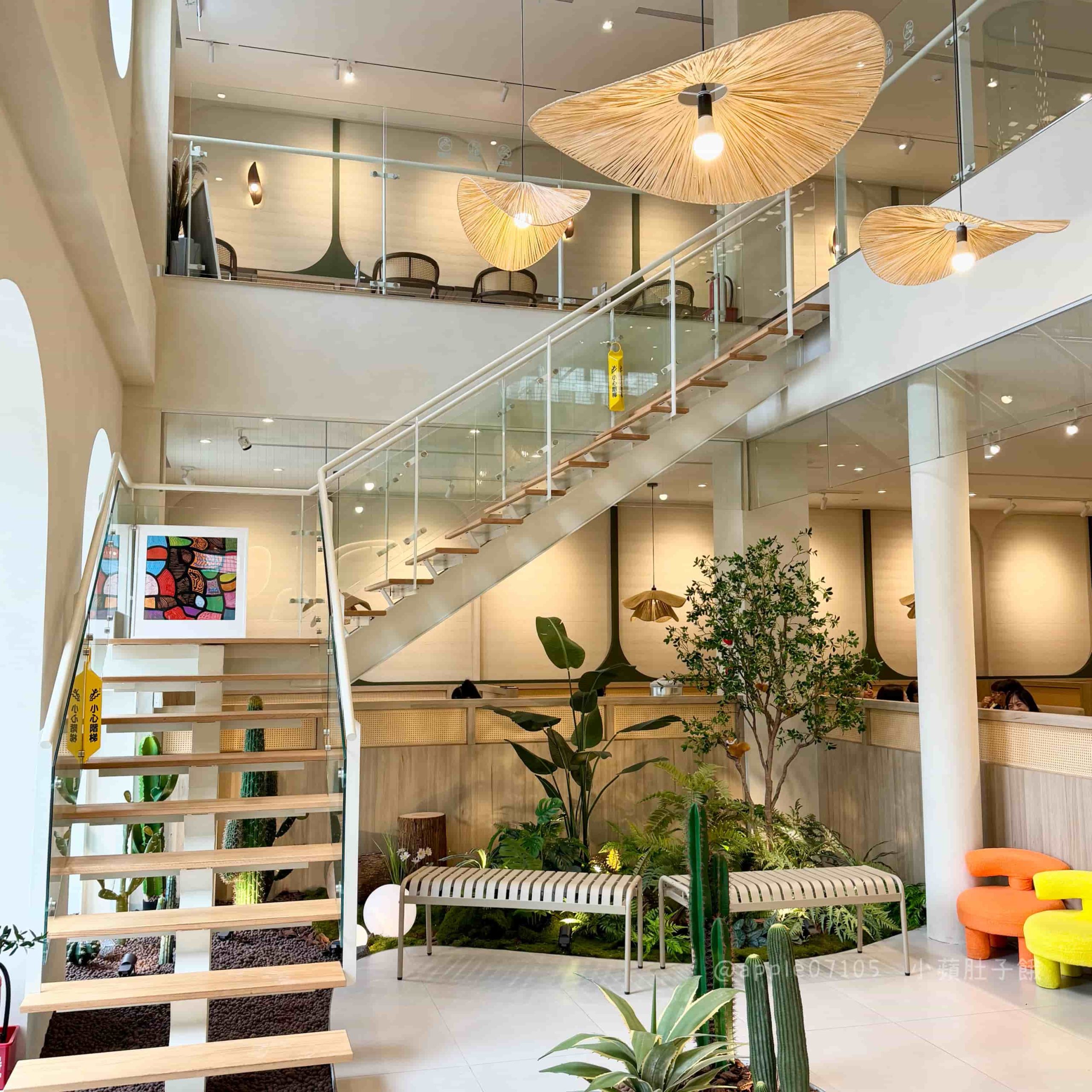 等候區有植栽造景,旁邊的透明玻璃樓梯把二樓視野一起延伸出來,整個環境非常開闊,不會有壓迫感