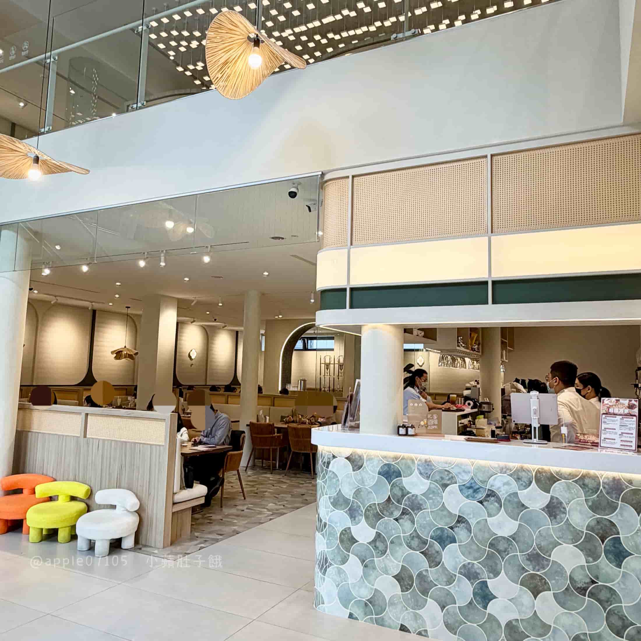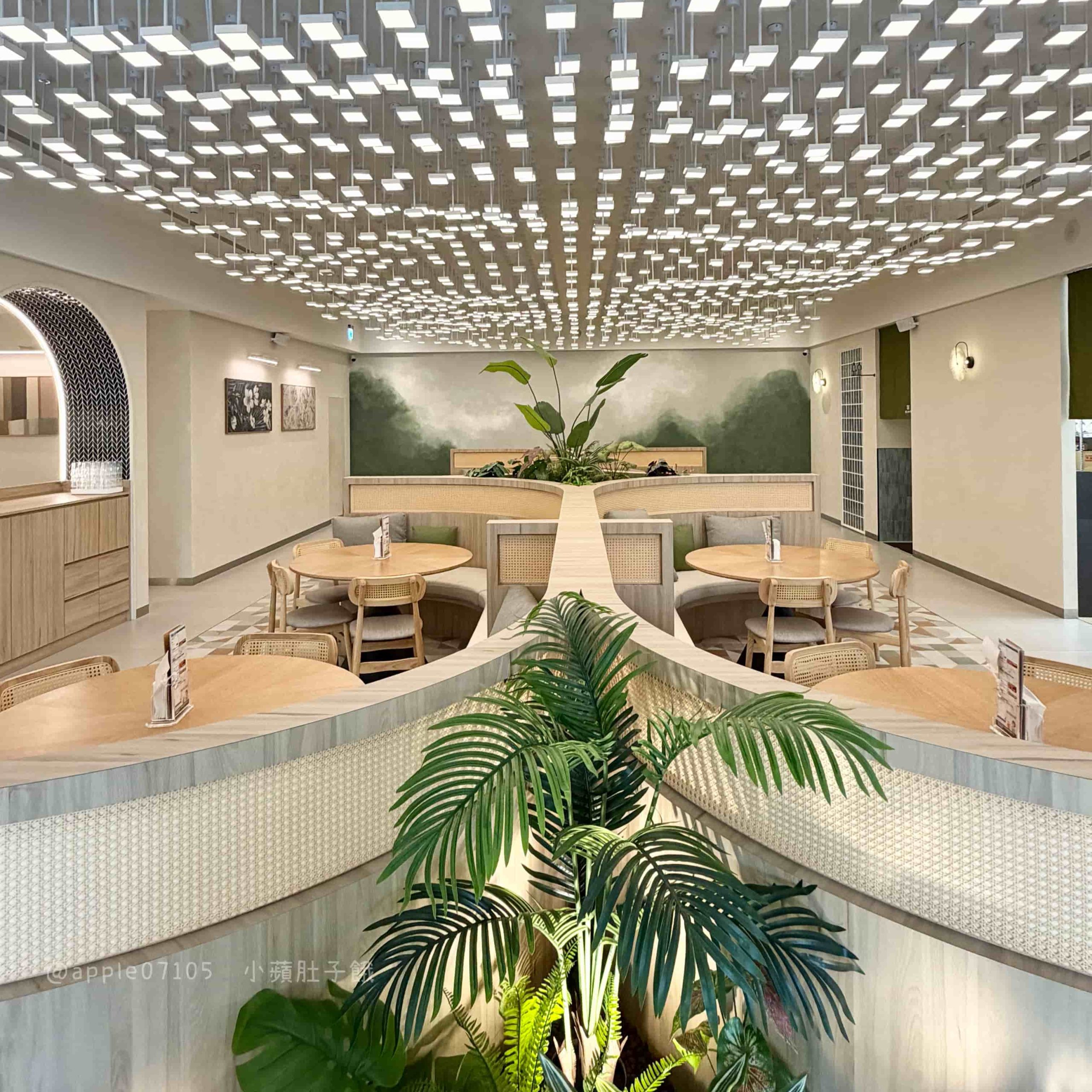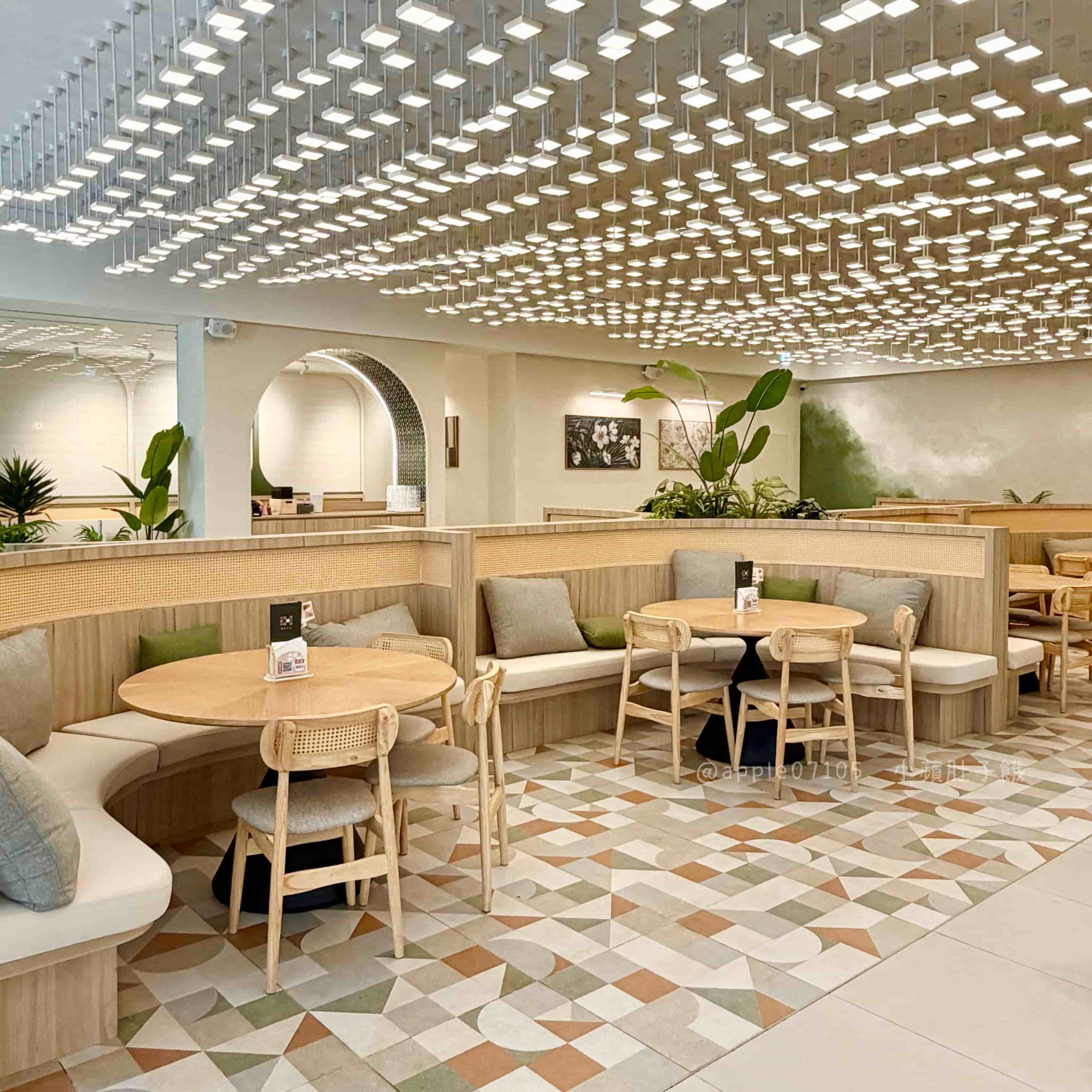 還有二樓的亮點,天花板滿滿的立體燈飾,視覺很有層次感,白天就這麼美感覺晚上會更美!這邊的桌距又更寬敞,加上綠色植栽點綴,讓大空間看起來乾淨又不單調,這種開放式布局很適合公司聚餐、團體包場或課後小型聚會!