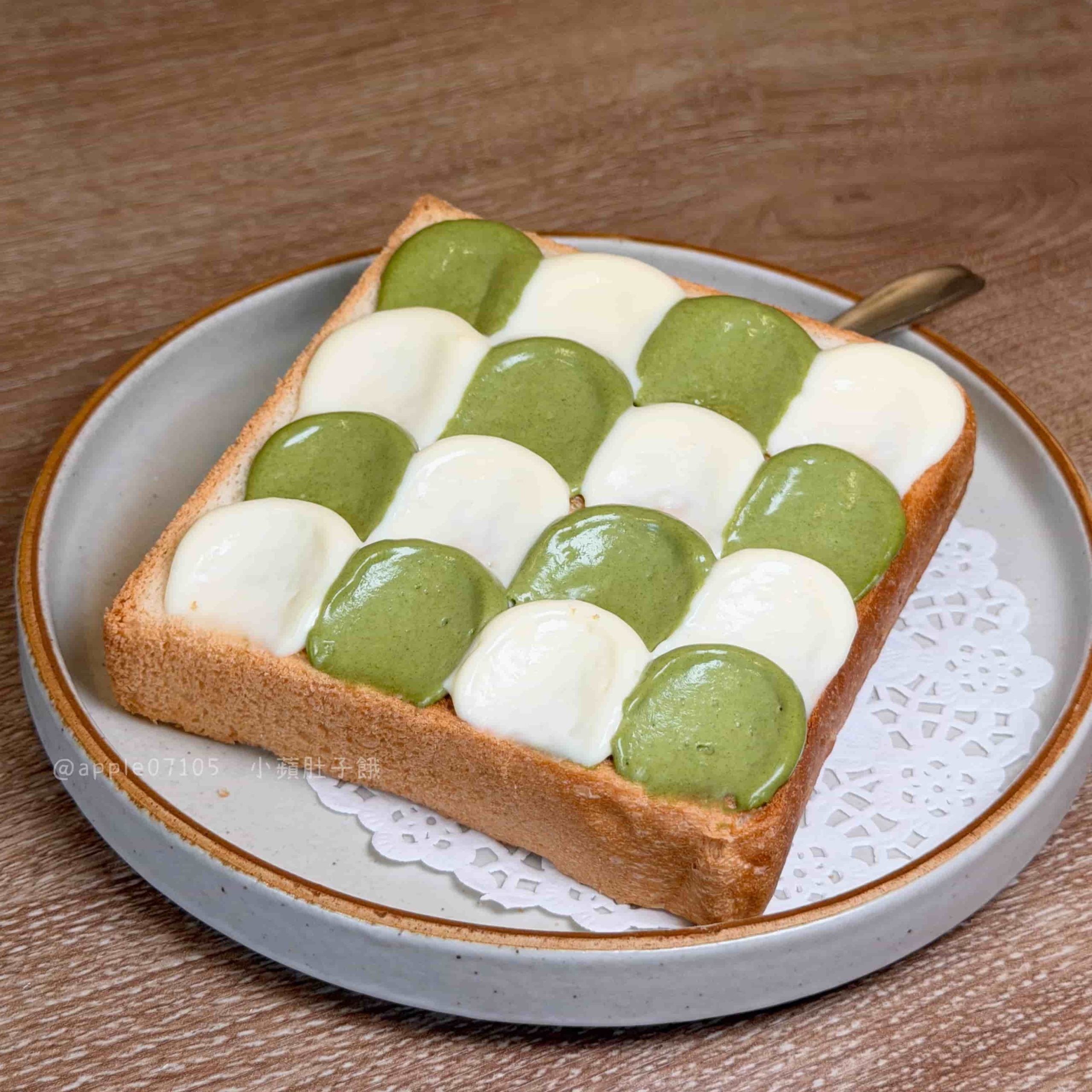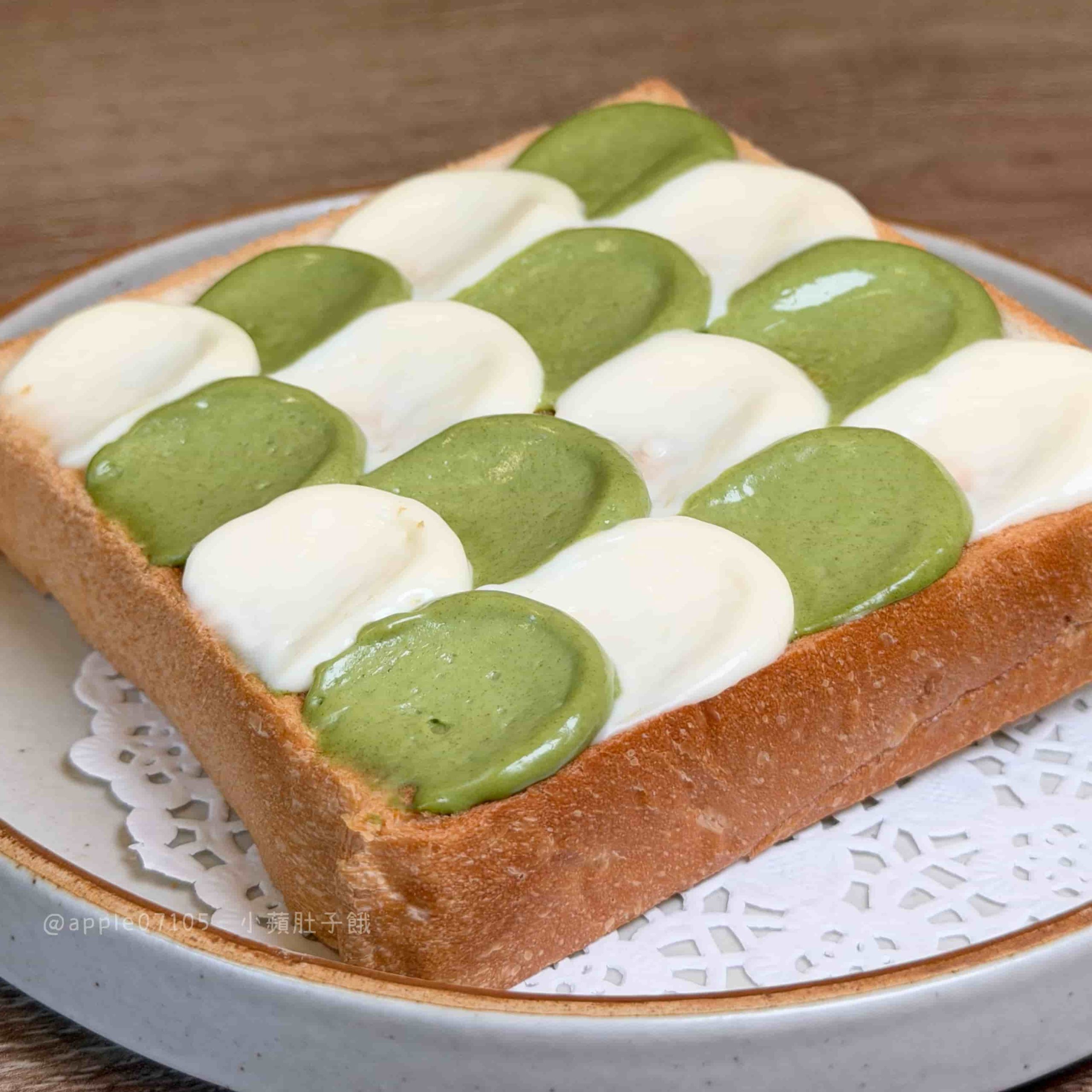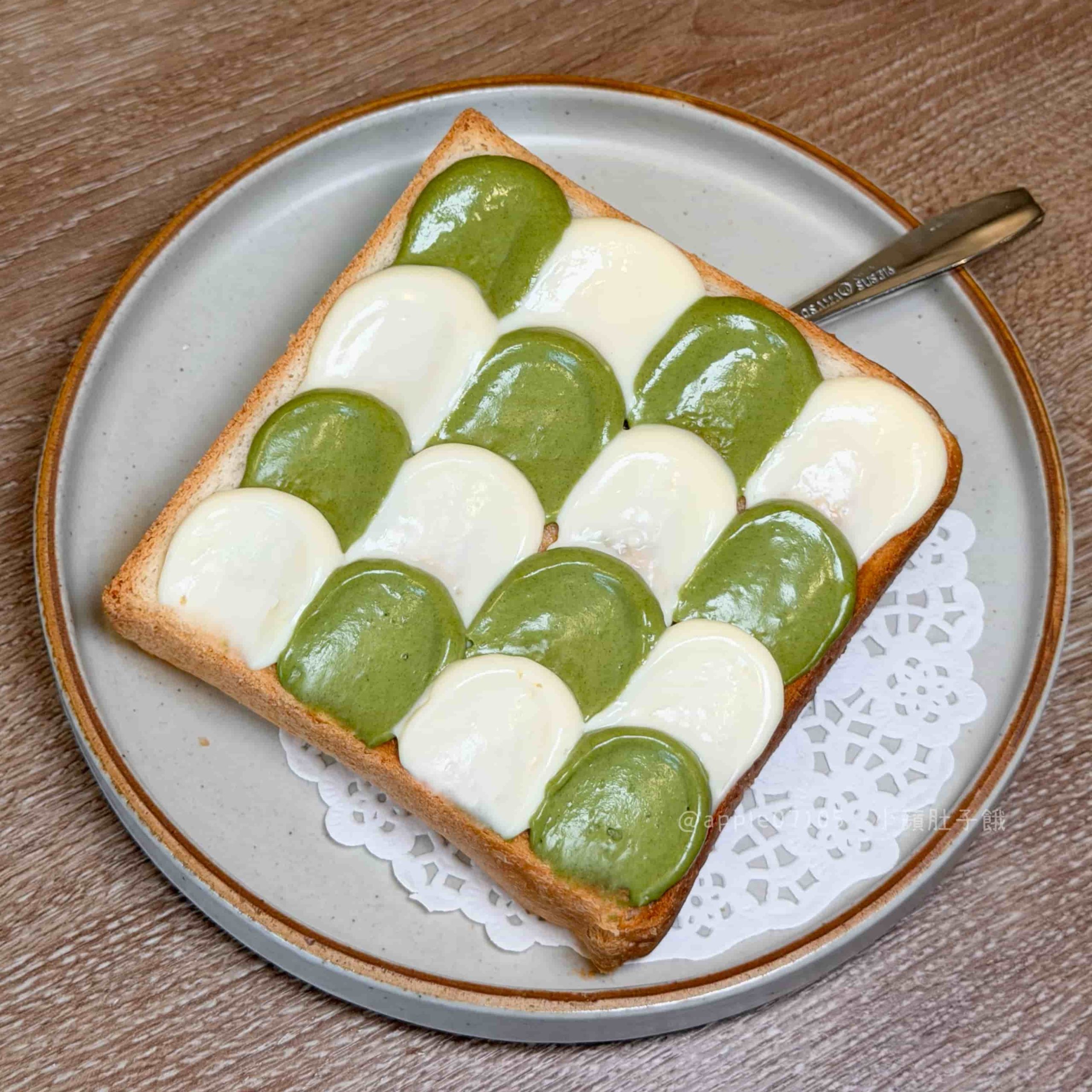 厚片本體烤得外層酥、裡面是紮實路線,搭配抹茶跟乳酪交錯的抹醬~抹茶醬味道濃郁,帶一點厚度但不會苦,乳酪醬微鹹奶香,醬都是濃郁滑順的質地口感,甜味明顯一些但不會膩,配茶更剛好