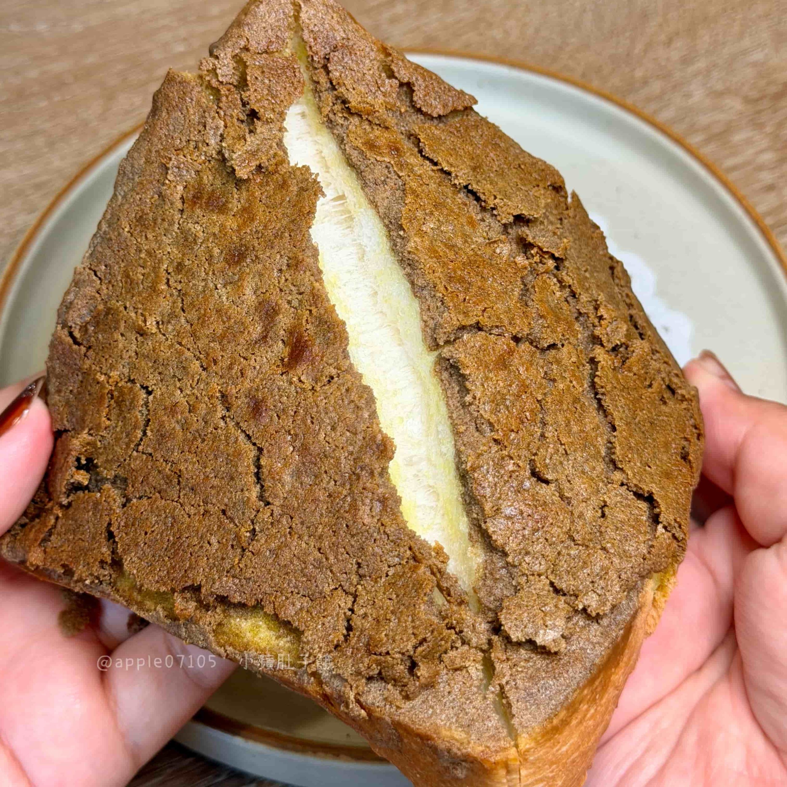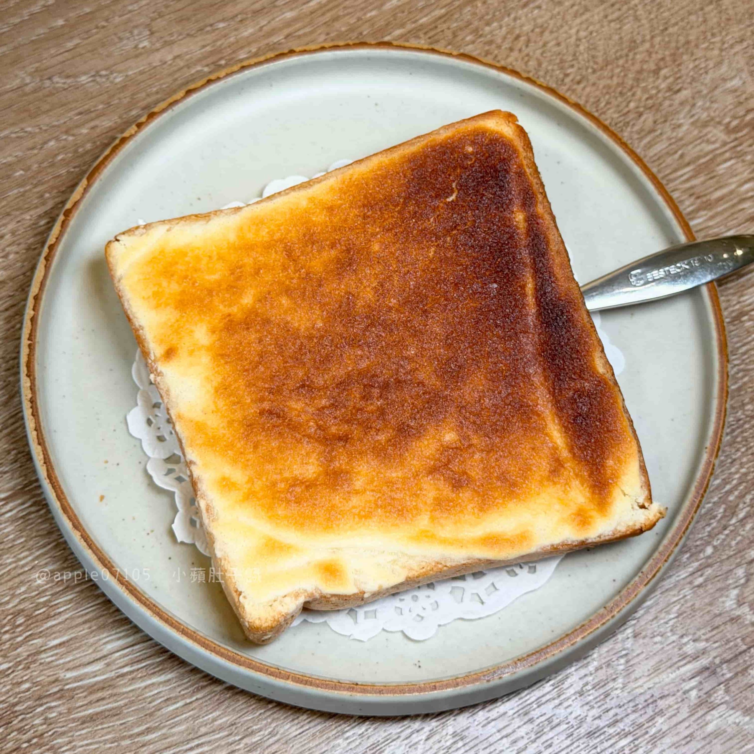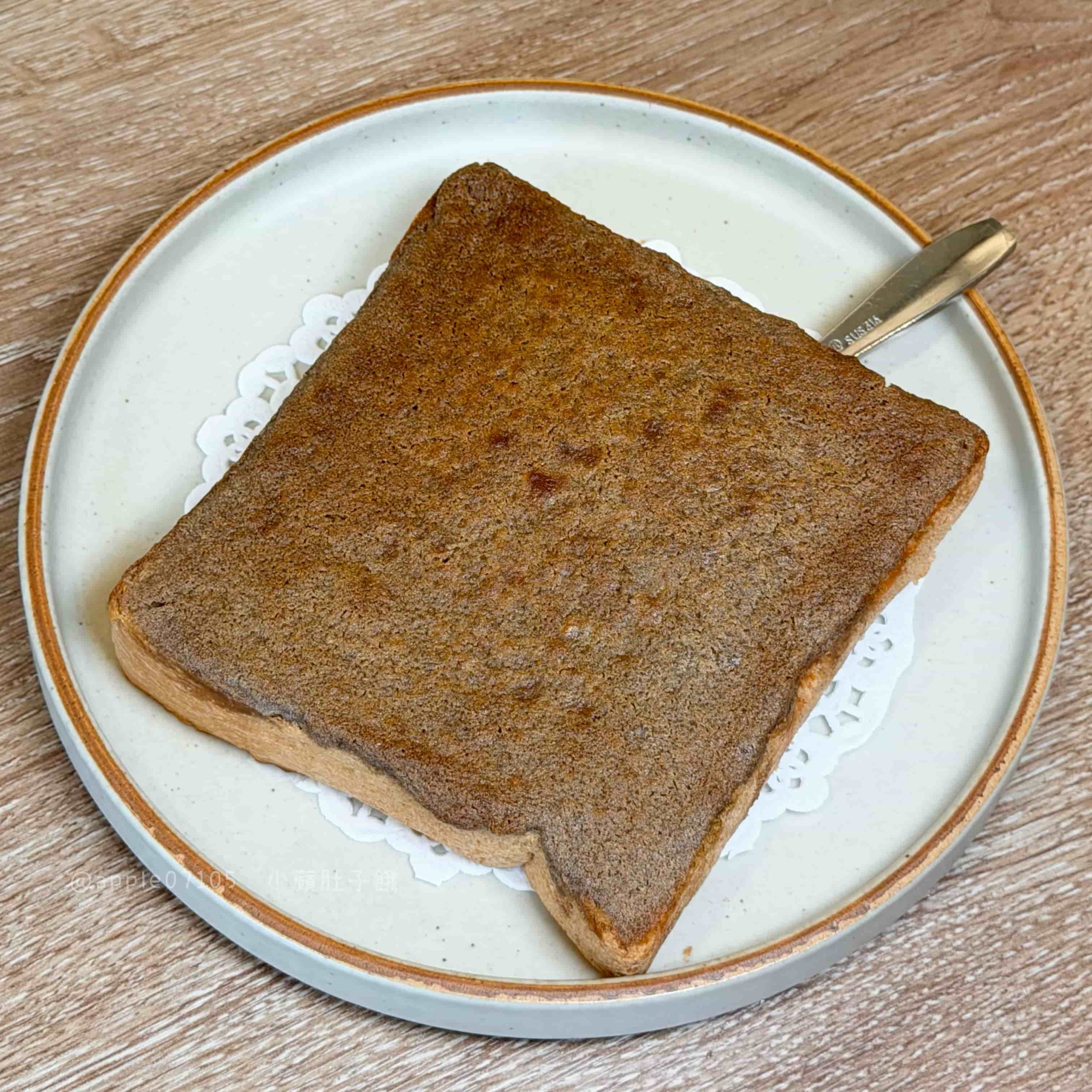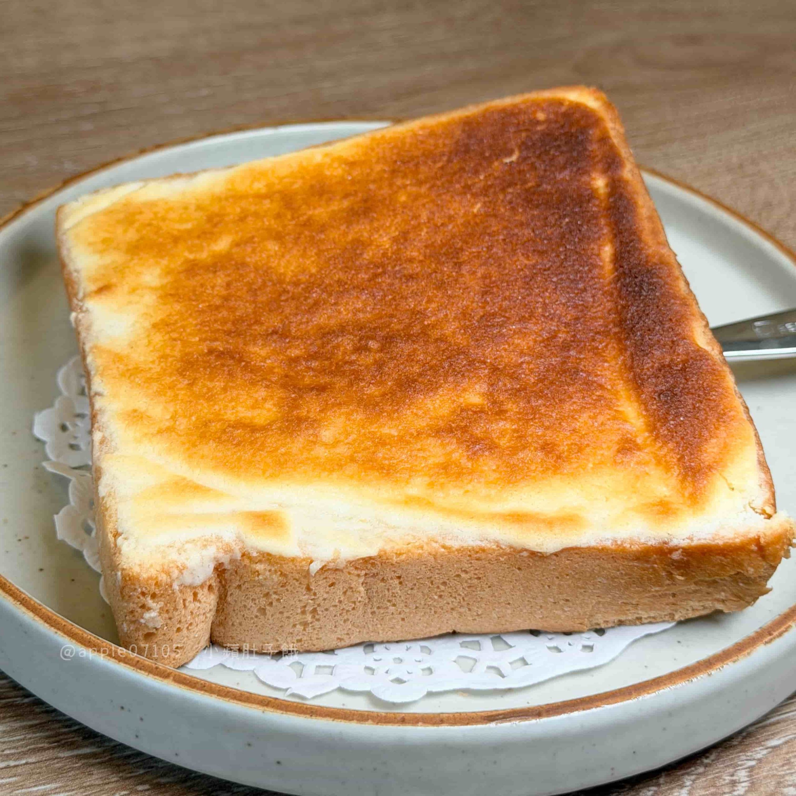 厚片本體烤得外層酥、裡面是紮實路線,搭配抹茶跟乳酪交錯的抹醬~抹茶醬味道濃郁,帶一點厚度但不會苦,乳酪醬微鹹奶香,醬都是濃郁滑順的質地口感,甜味明顯一些但不會膩,配茶更剛好