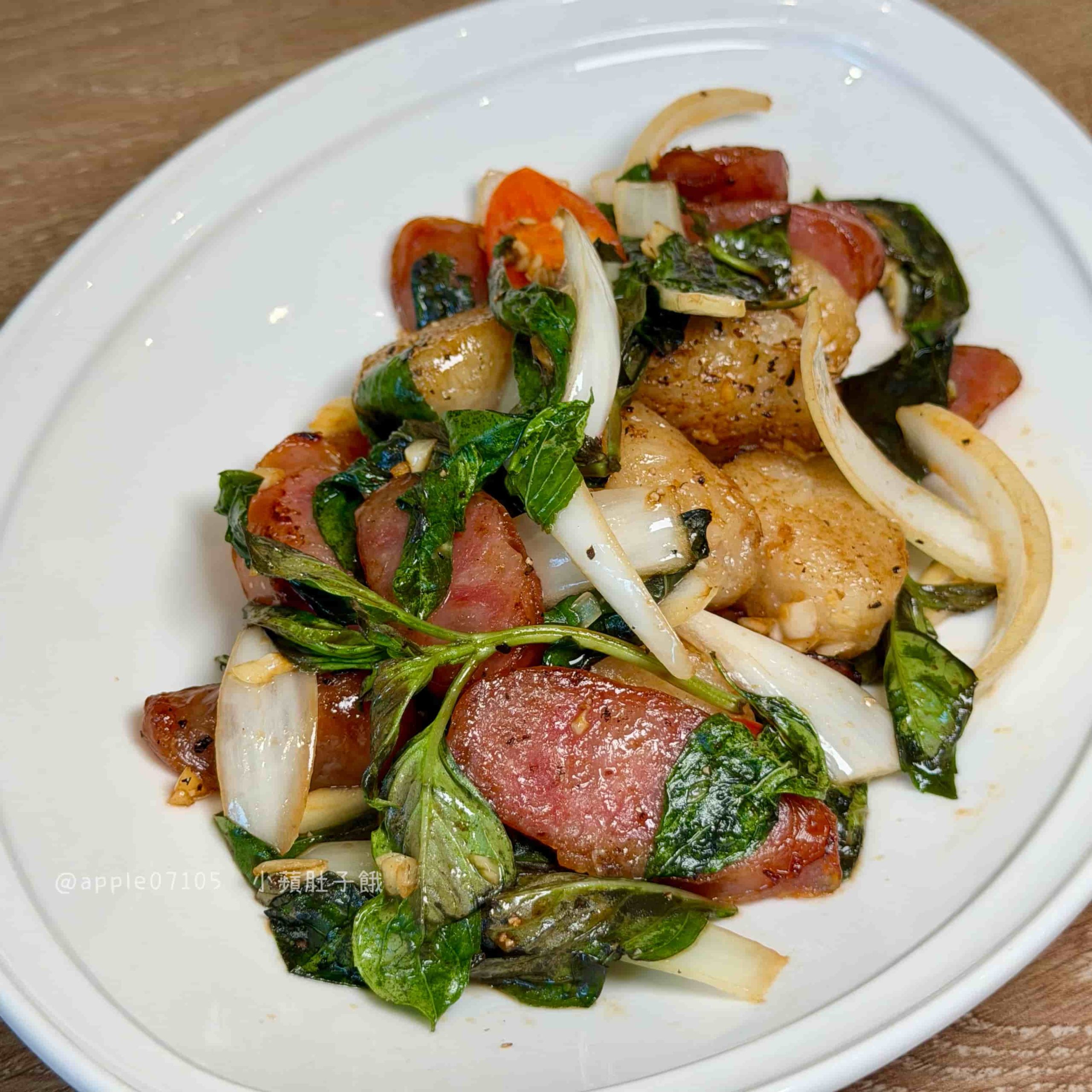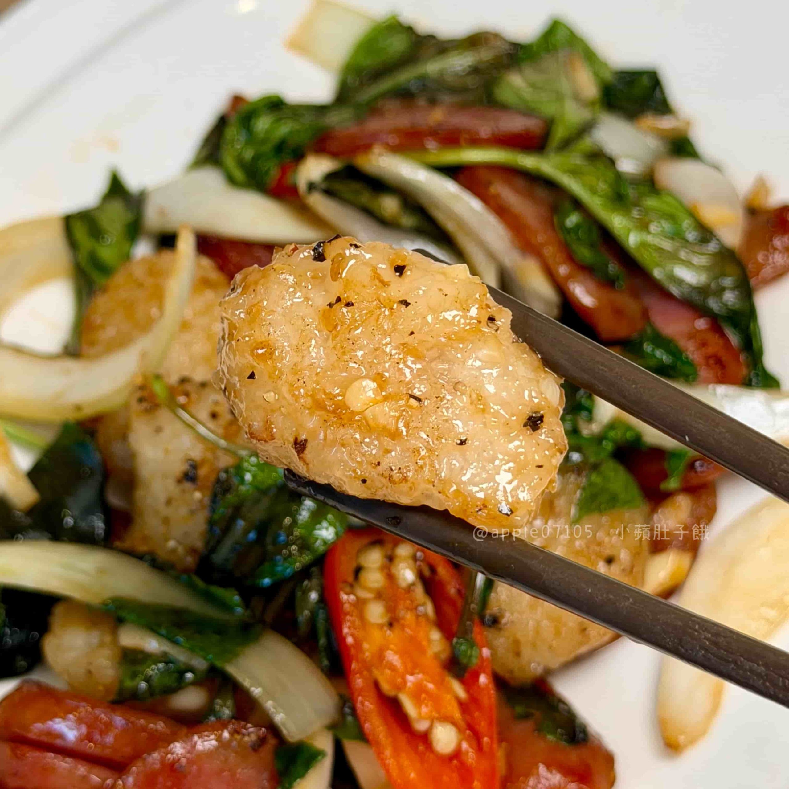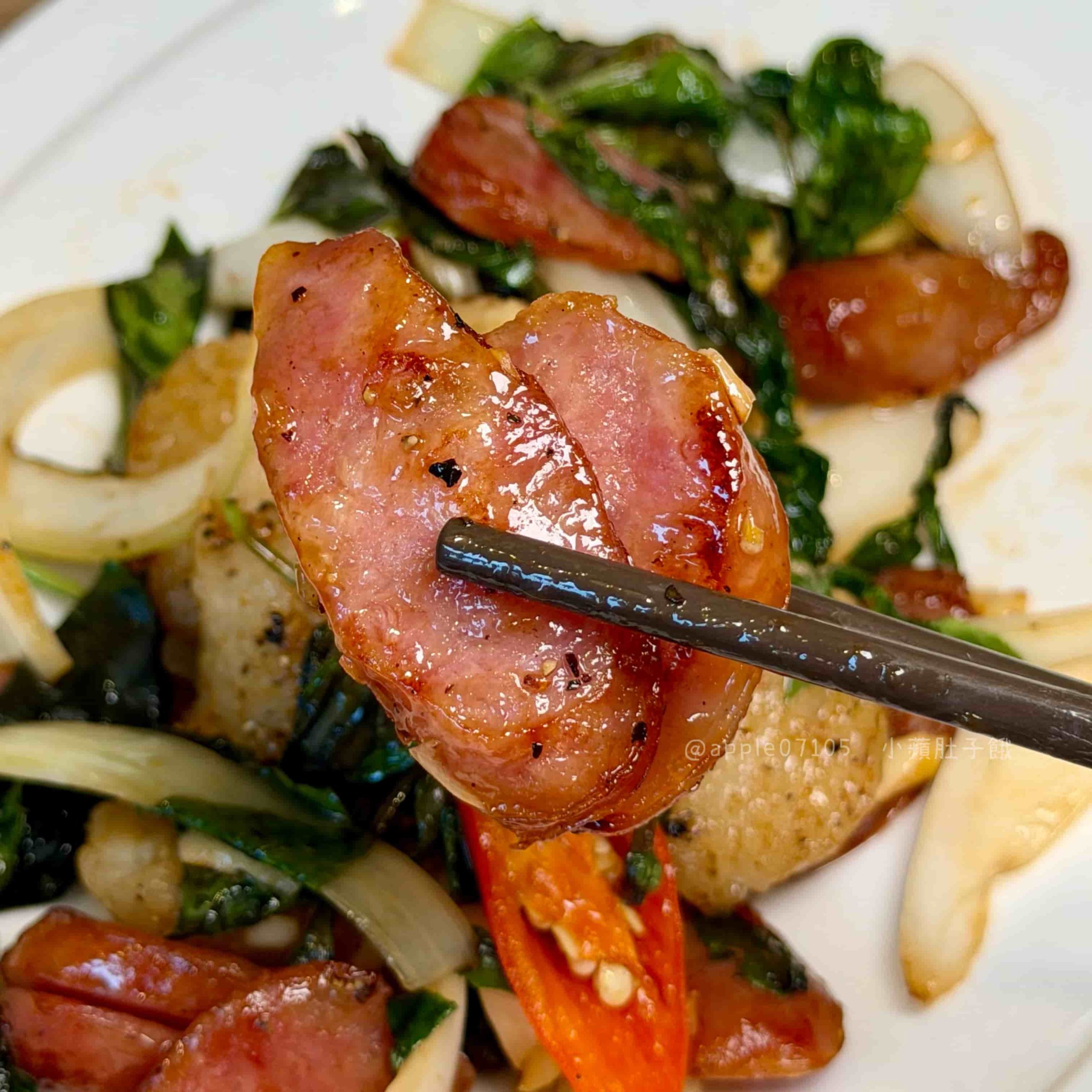 一吃就是濃郁蒜香~香腸本身偏甜,咬起來油脂香氣明顯,外層煎到有點焦脆,味道很香,米腸的口感是軟Q帶點黏的那種,外面裹著醬香,吃起來不會乾,搭配洋蔥、蒜頭本身的辛辣辛香,很提味好爽!