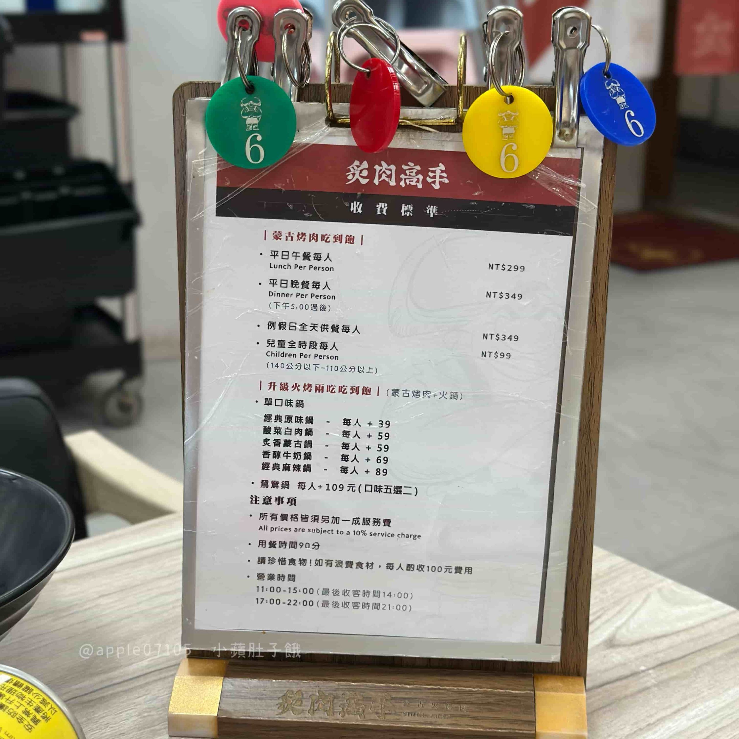 炙肉高手的價位:平日午餐只要 299 元就能蒙古烤肉吃到飽,晚餐及假日為 349 元,兒童則是99元,都很超值!另外只要最低加價39元就能升級火鍋,皆需另加一成服務費、用餐限制90分鐘