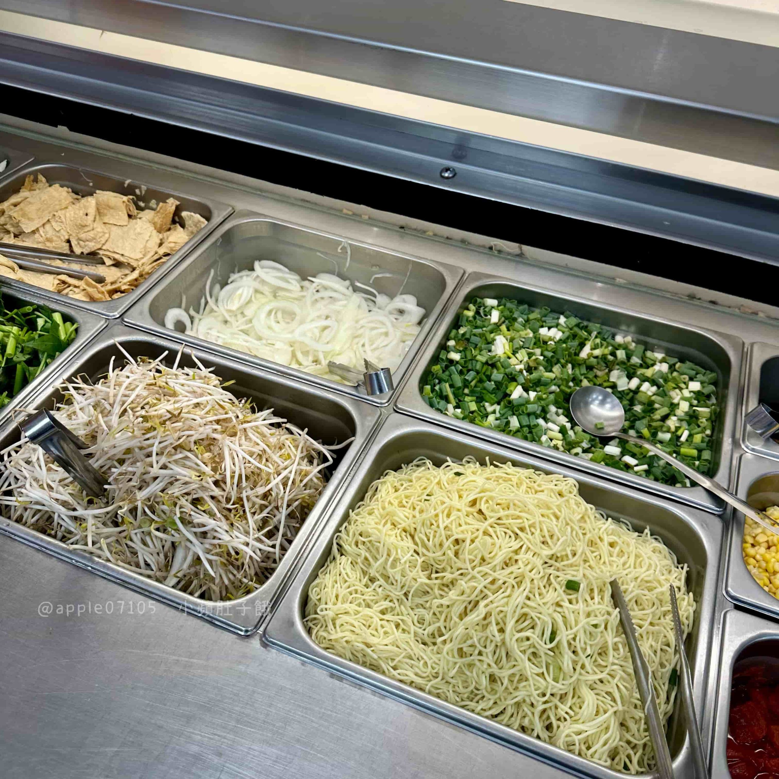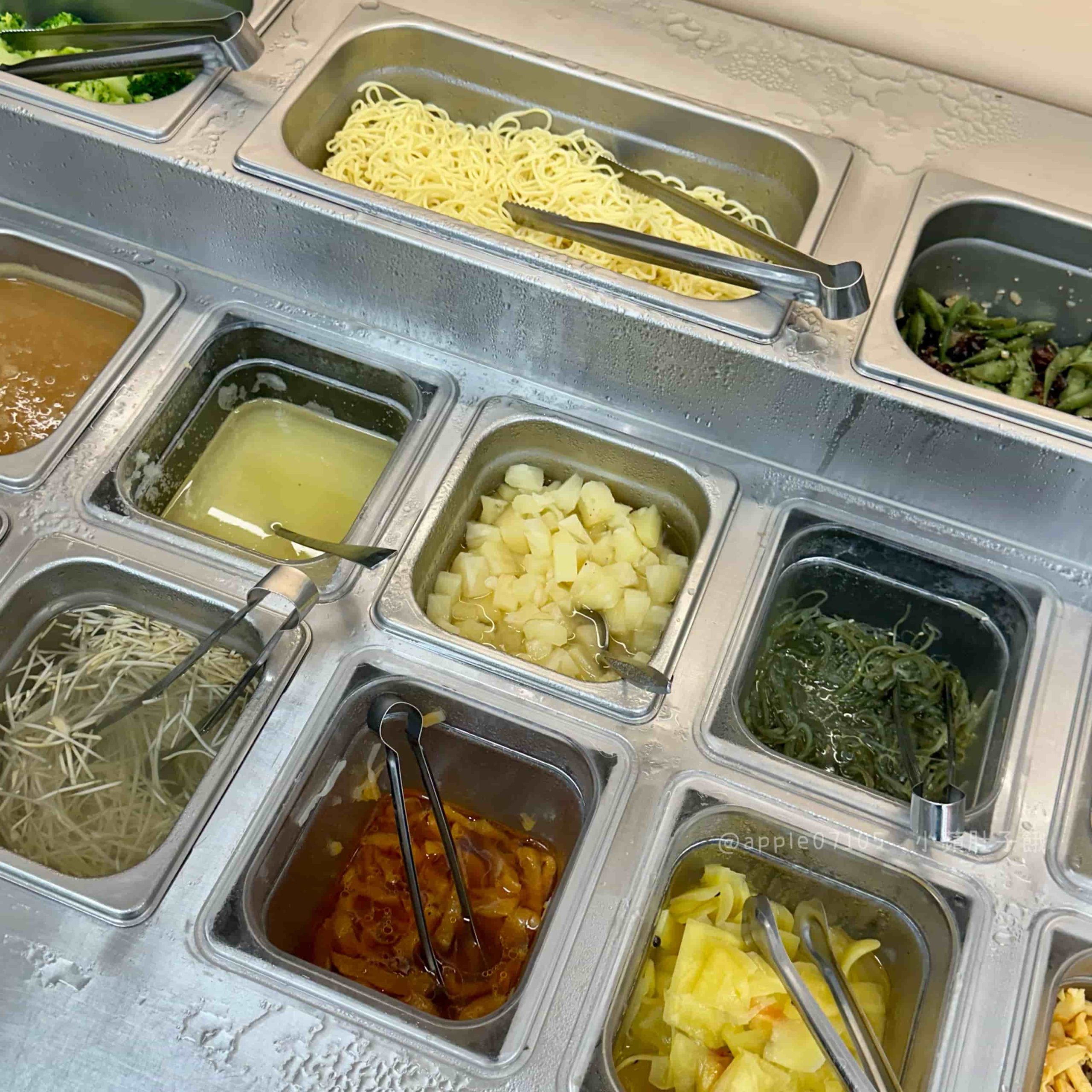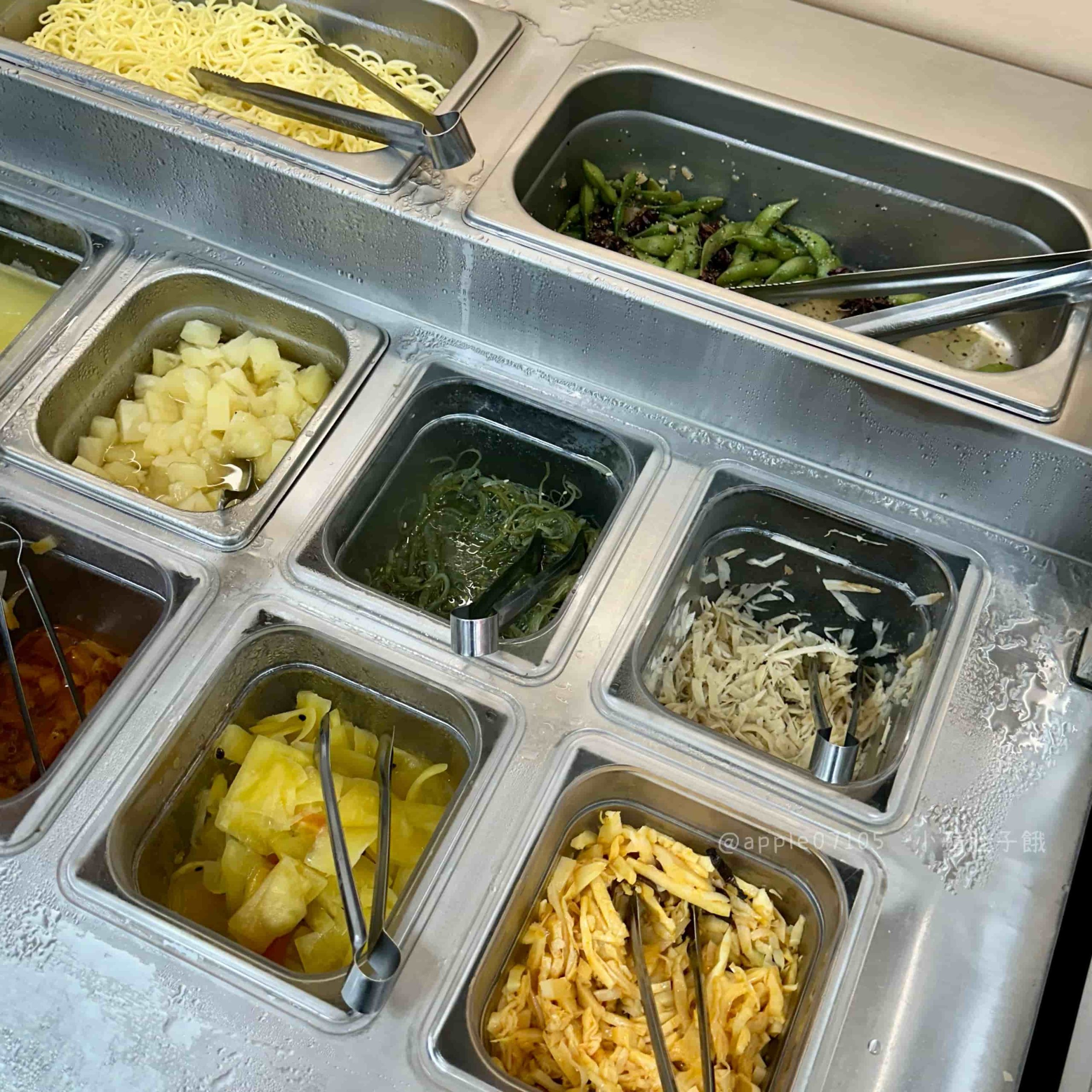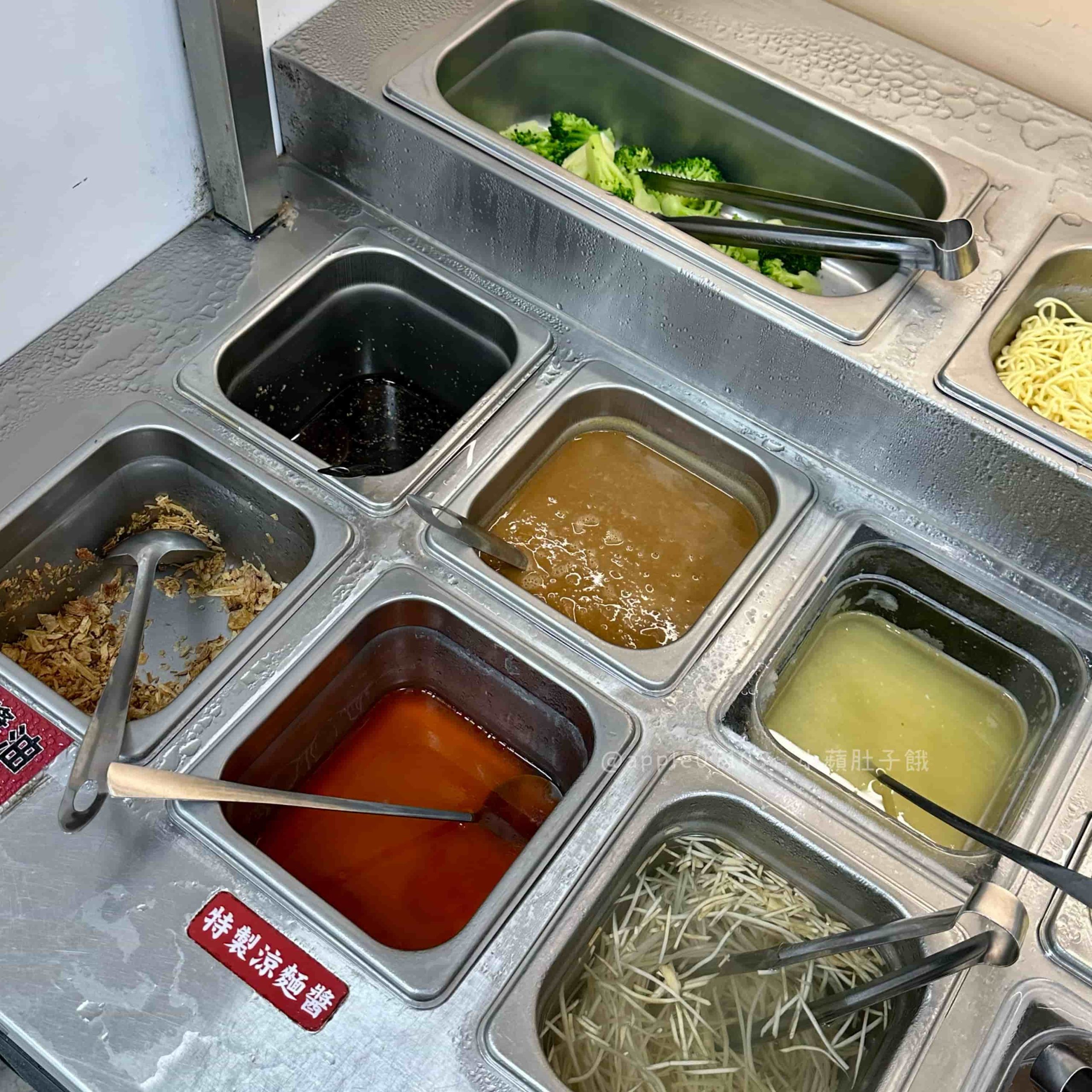 涼麵與小菜區選擇超多,特製涼麵醬、胡麻醬、辣醬任你搭配,還有小黃瓜絲、洋蔥絲等配料自己DIY;小菜則有泡菜、海帶絲、毛豆、筍絲、牛蒡絲等,多樣又清爽,搭配主餐很解膩