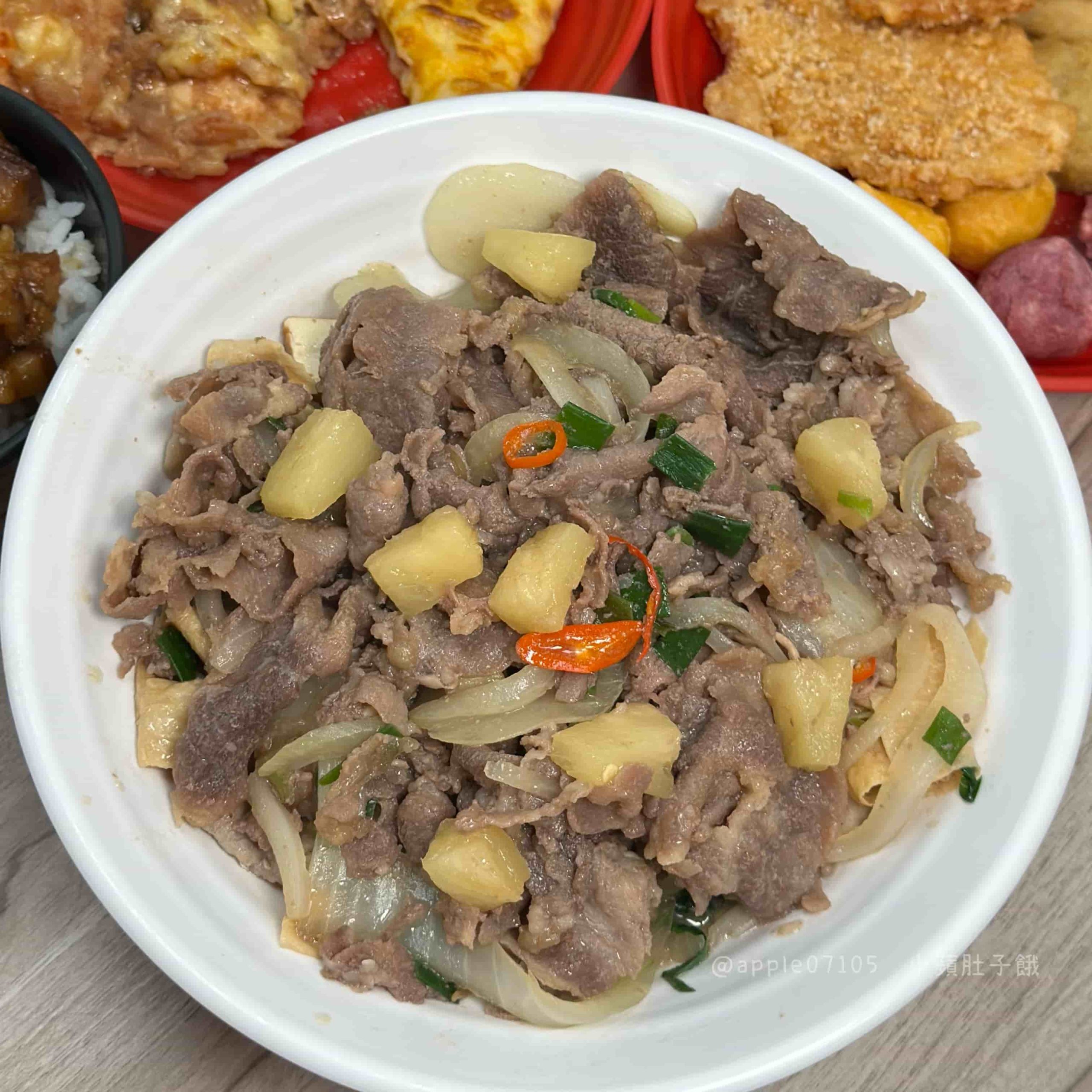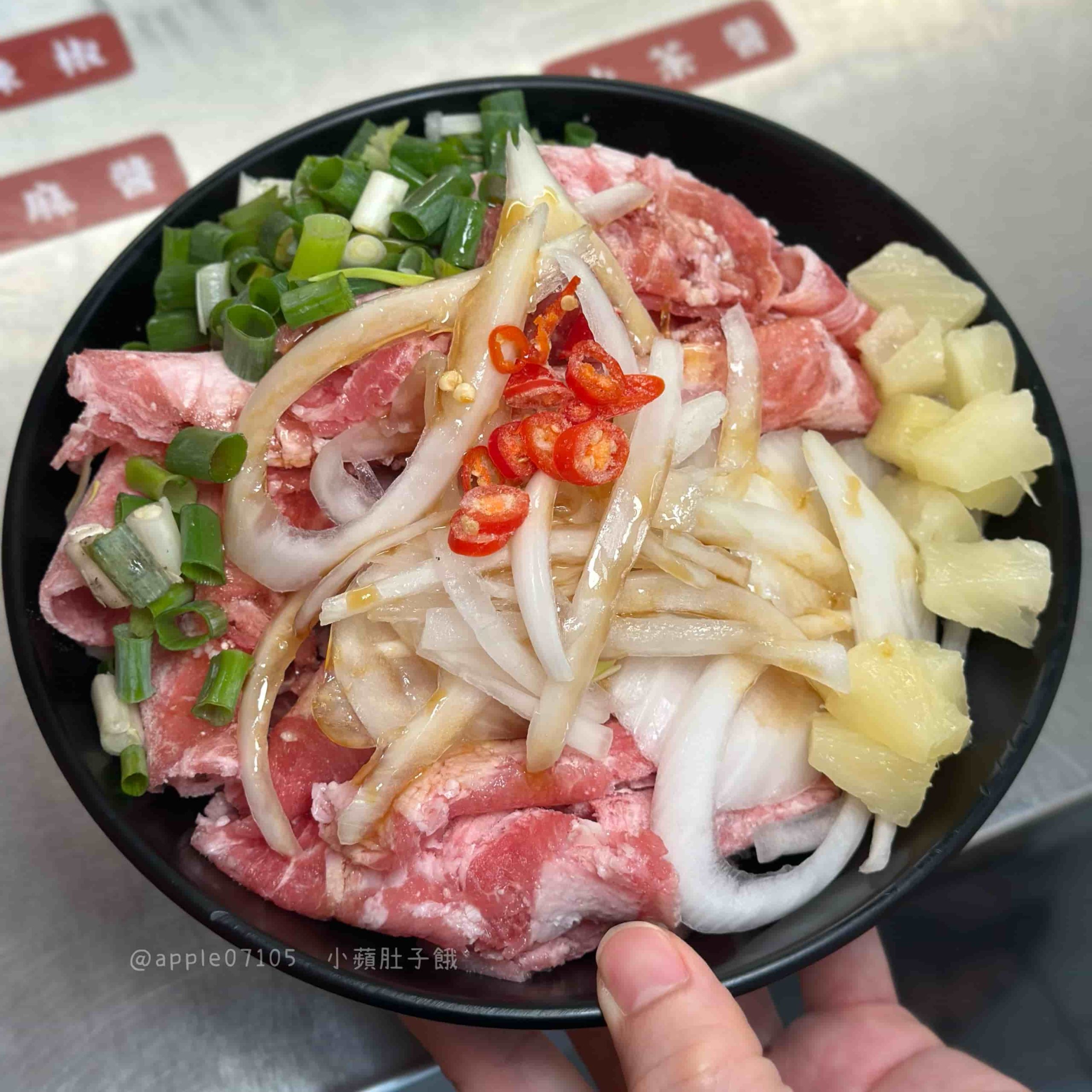 炒好的蒙古烤肉店家會直接送到座位區,不用自己在那邊等待~每碗都是依照自己剛剛挑的食材、淋的醬料去快炒,所以味道完全專屬!像是加了鳳梨、辣椒的組合,炒出酸甜帶辣的滋味,超級開胃