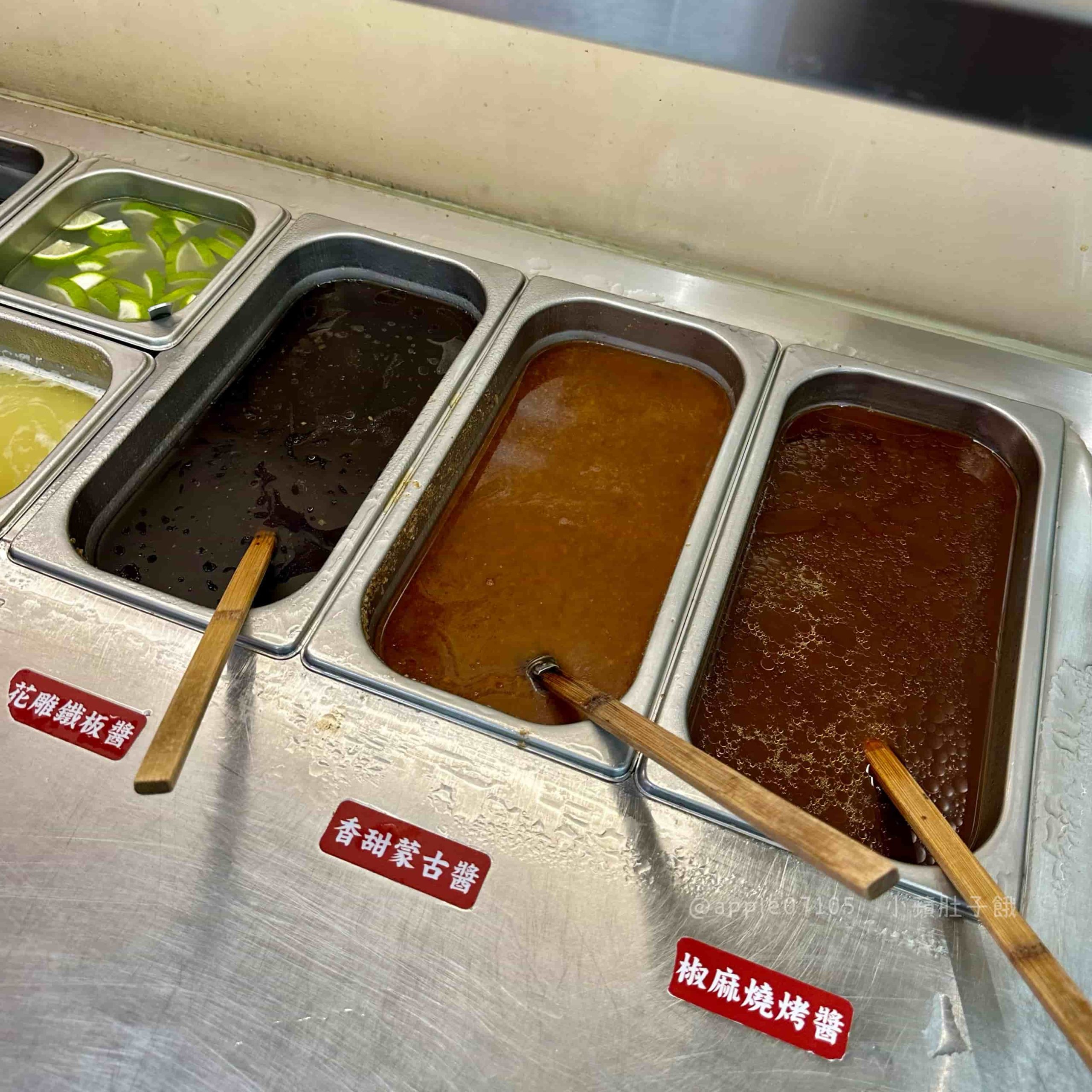 花雕鐵板醬、香甜蒙古醬、椒麻燒烤醬