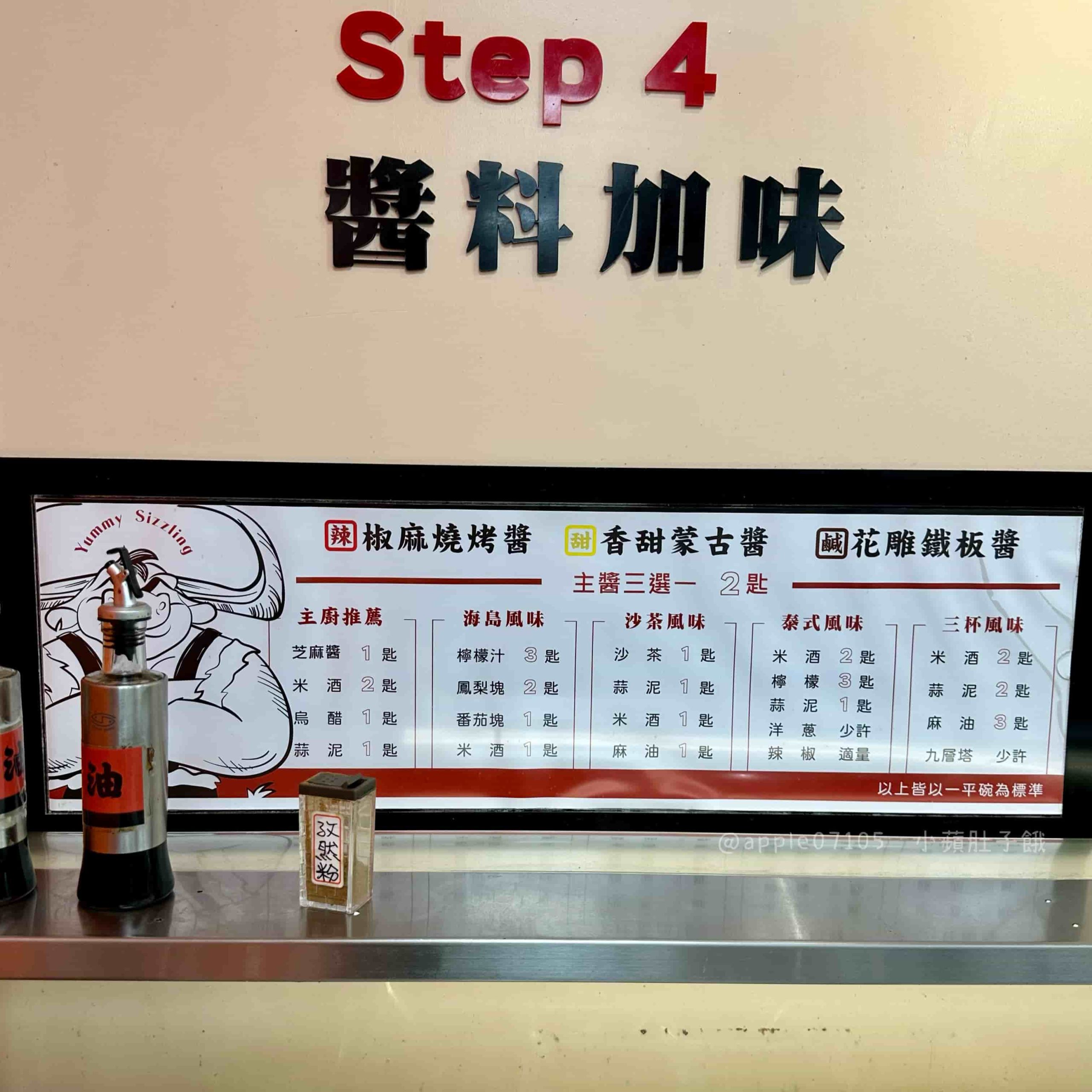 蒙古烤肉的精隨就在醬料!店內準備了 15 種醬料,牆面上還貼心提供風味配方參考,像是海島風味、沙茶風味、泰式風味、三杯風味等,每碗都能調出不一樣的驚喜