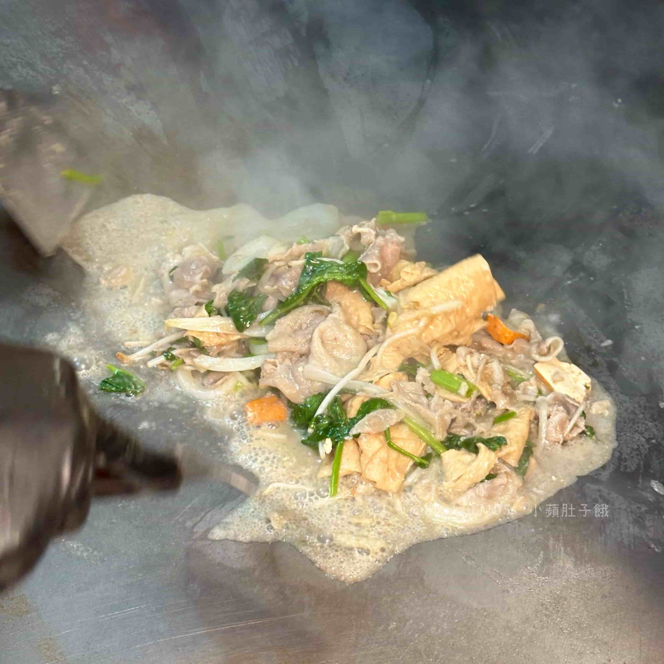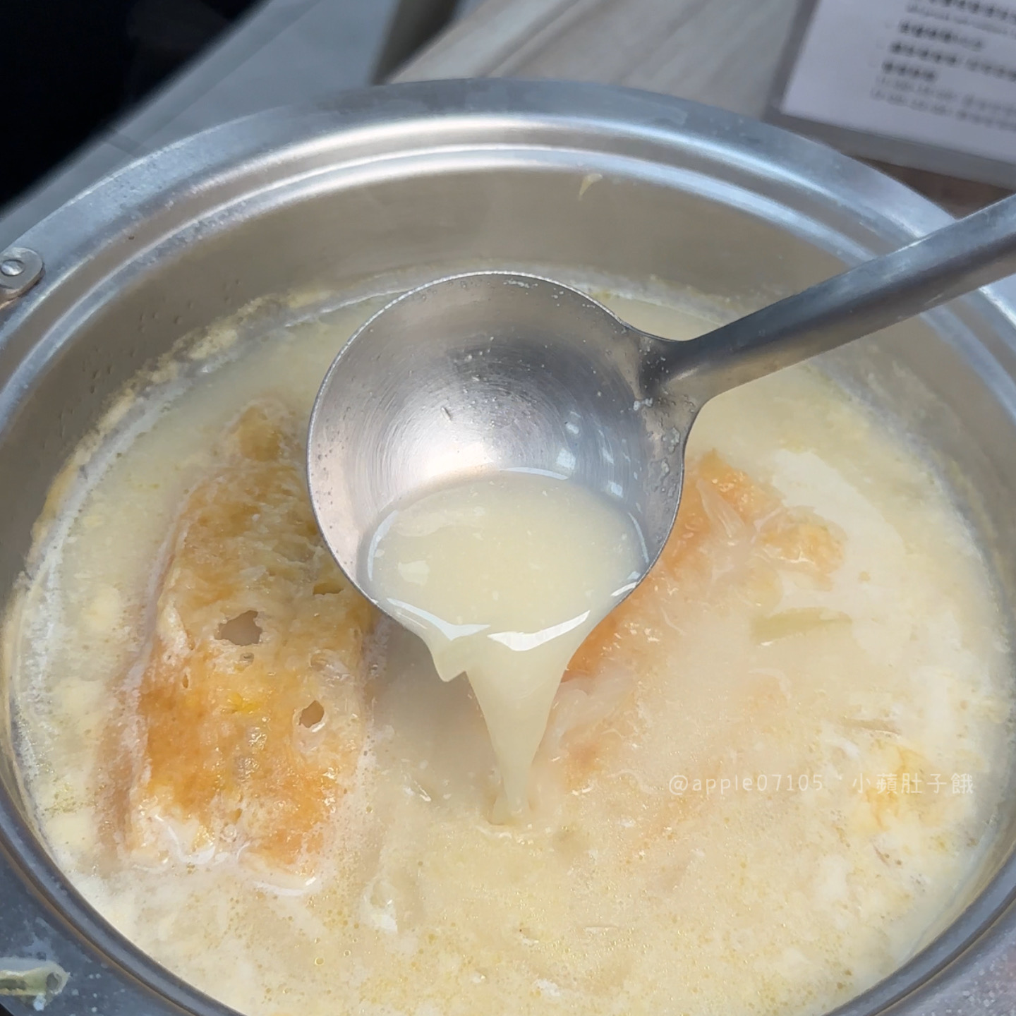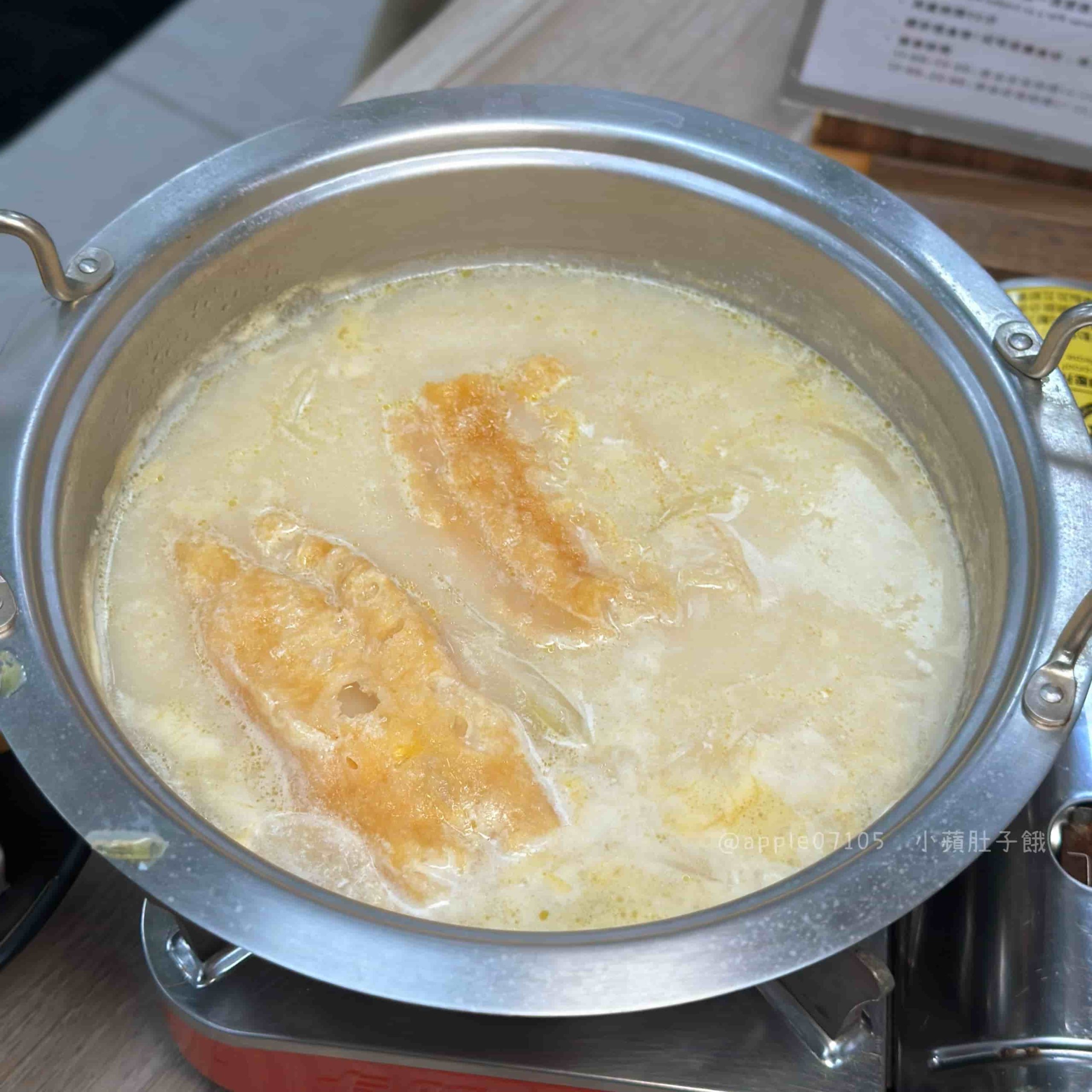 乳白色湯頭喝起來濃郁帶甜,裡頭還有油條一起熬煮,吸滿湯汁後口感軟中帶脆