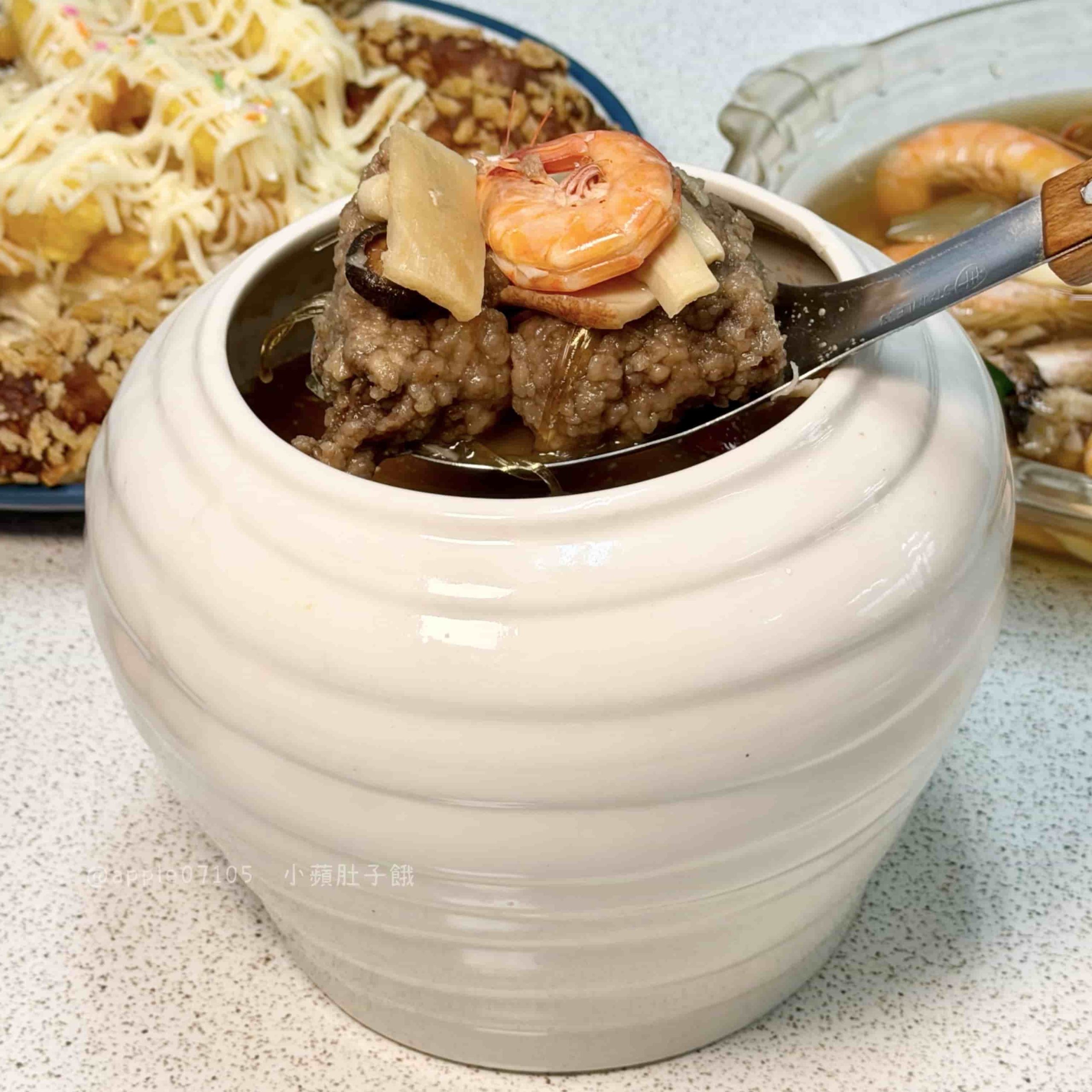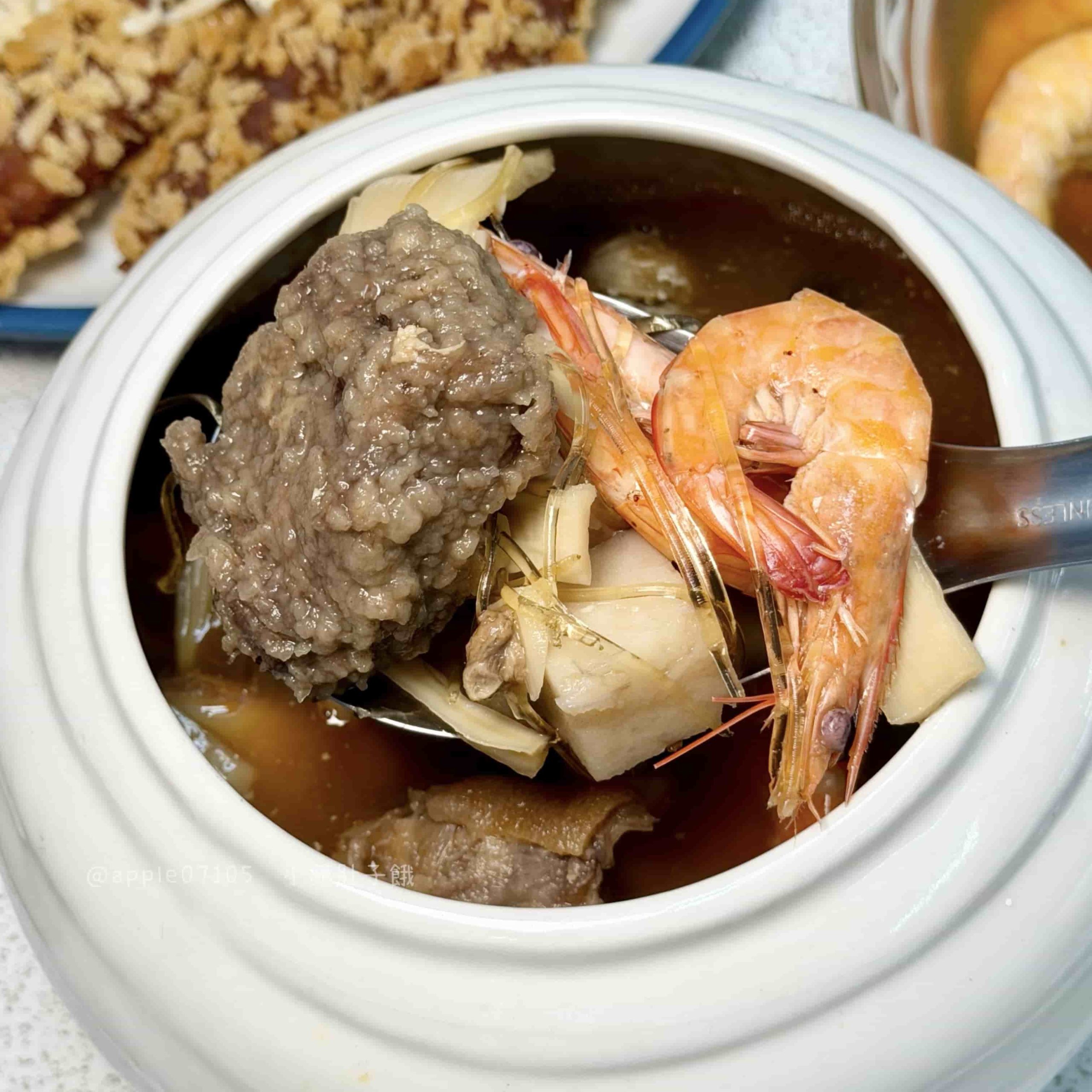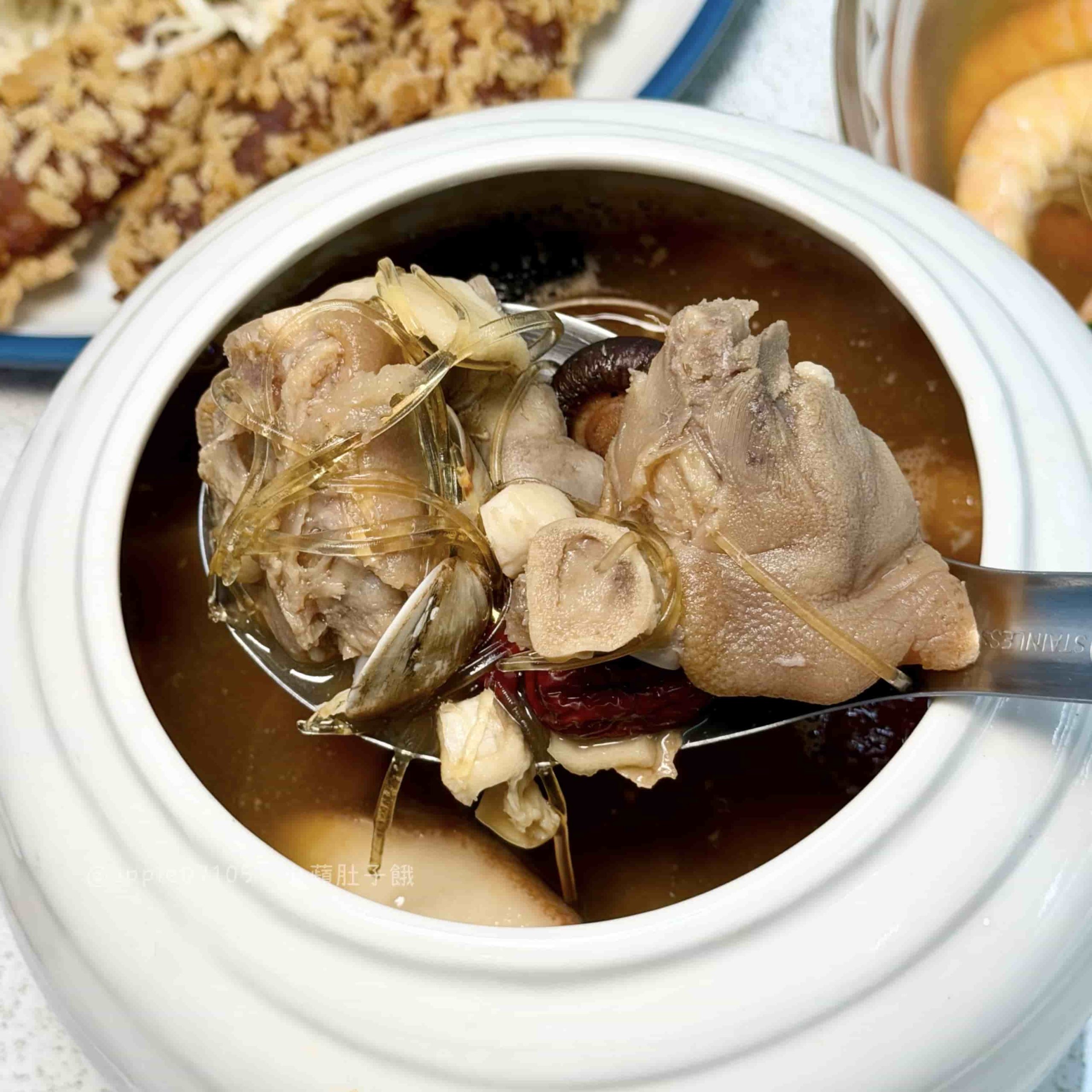 裡面的配料種類多,豬腳、排骨酥、蝦子、鮑魚片、香菇、芋頭、冬粉翅等等超多料啊~口感層次也很豐富!