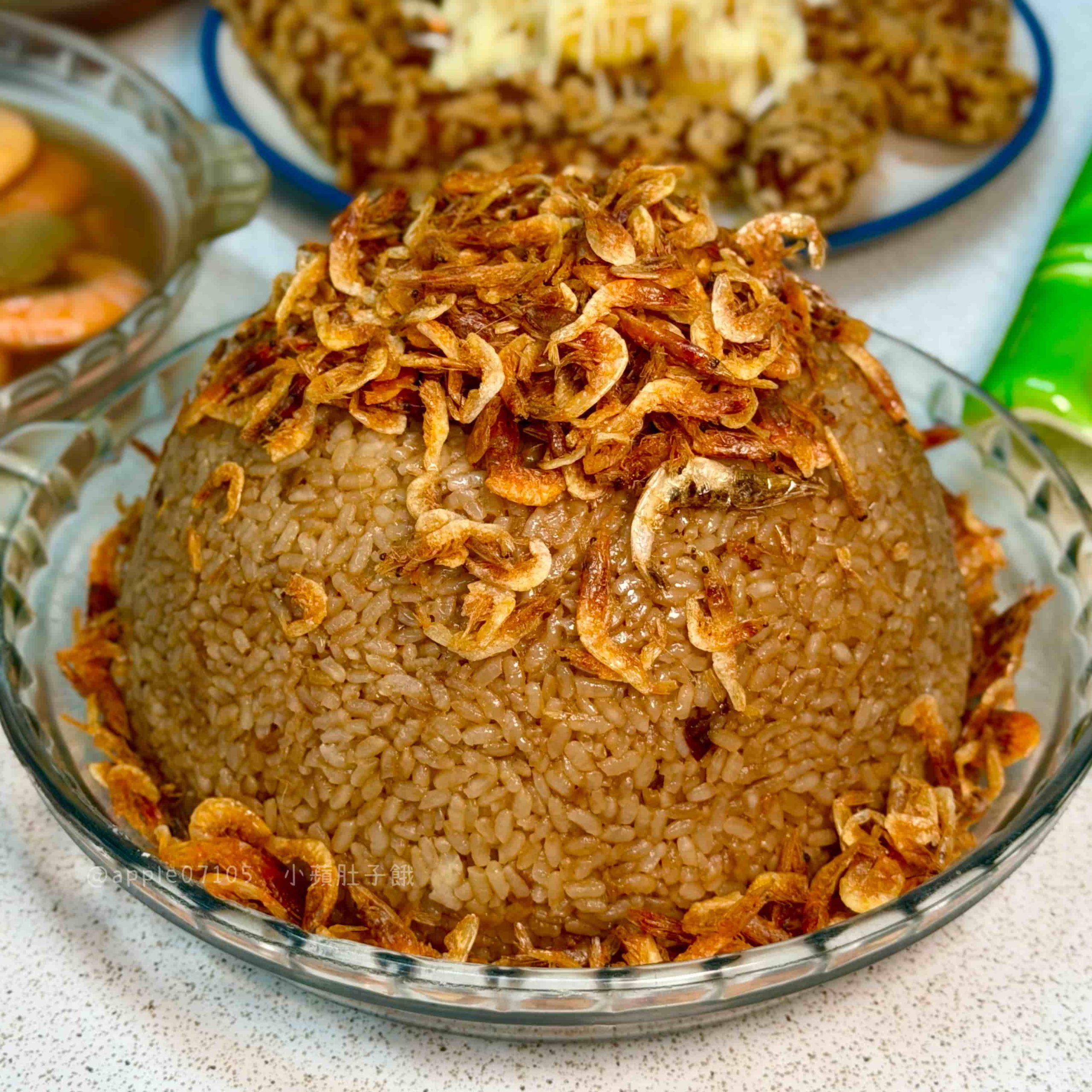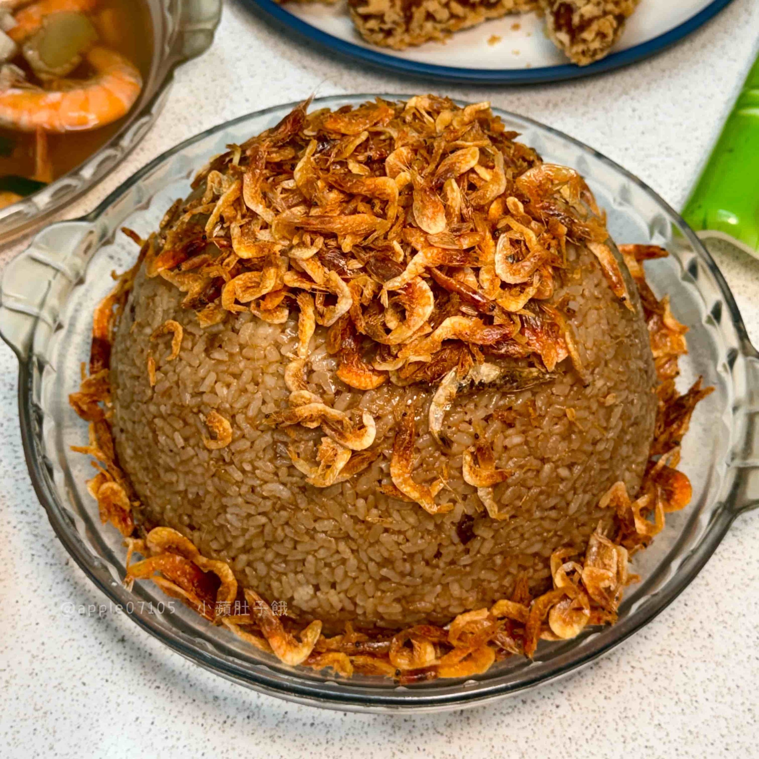 上層鋪滿櫻花蝦,香氣很明顯,油飯本體口感我覺得蠻軟但不會爛,每一口都能吃到米飯吸附醬香、薑香的味道