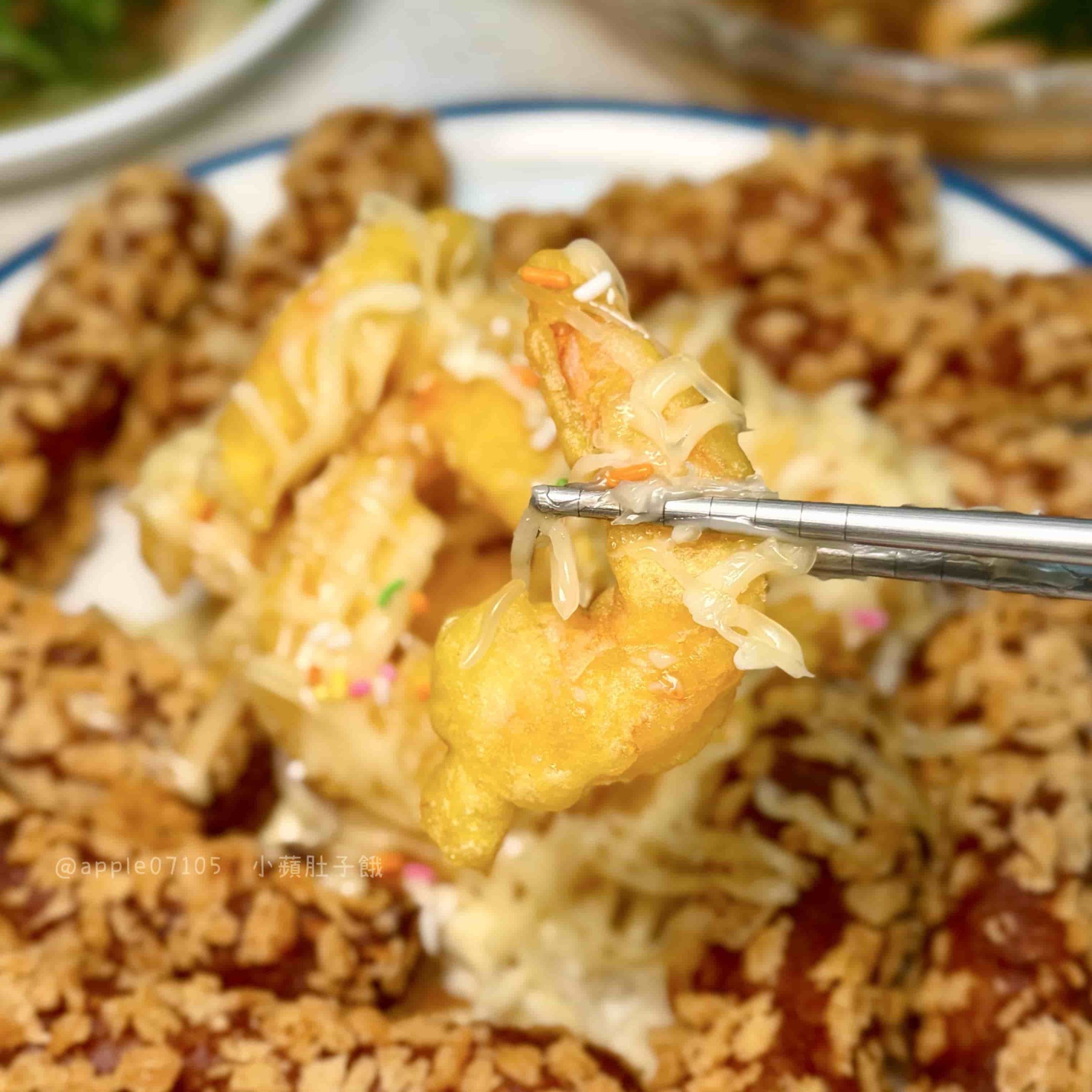 同時有蝦球+海鮮捲~蝦球是帶有點厚度的麵衣,裡面蝦肉Q,外層裹上美乃滋甜甜的好吃