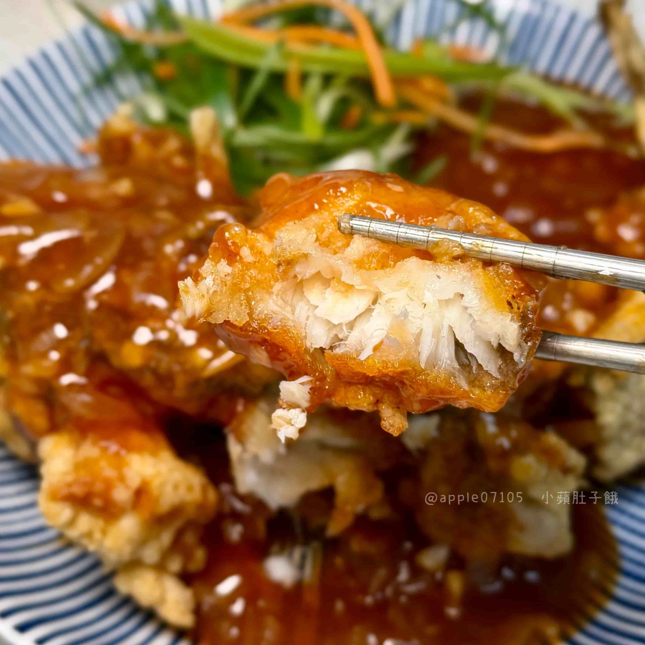 糖醋醬汁我覺得是酸酸甜甜,稍微偏酸一點,搭配洋蔥丁多了一點清爽感,不容易吃膩