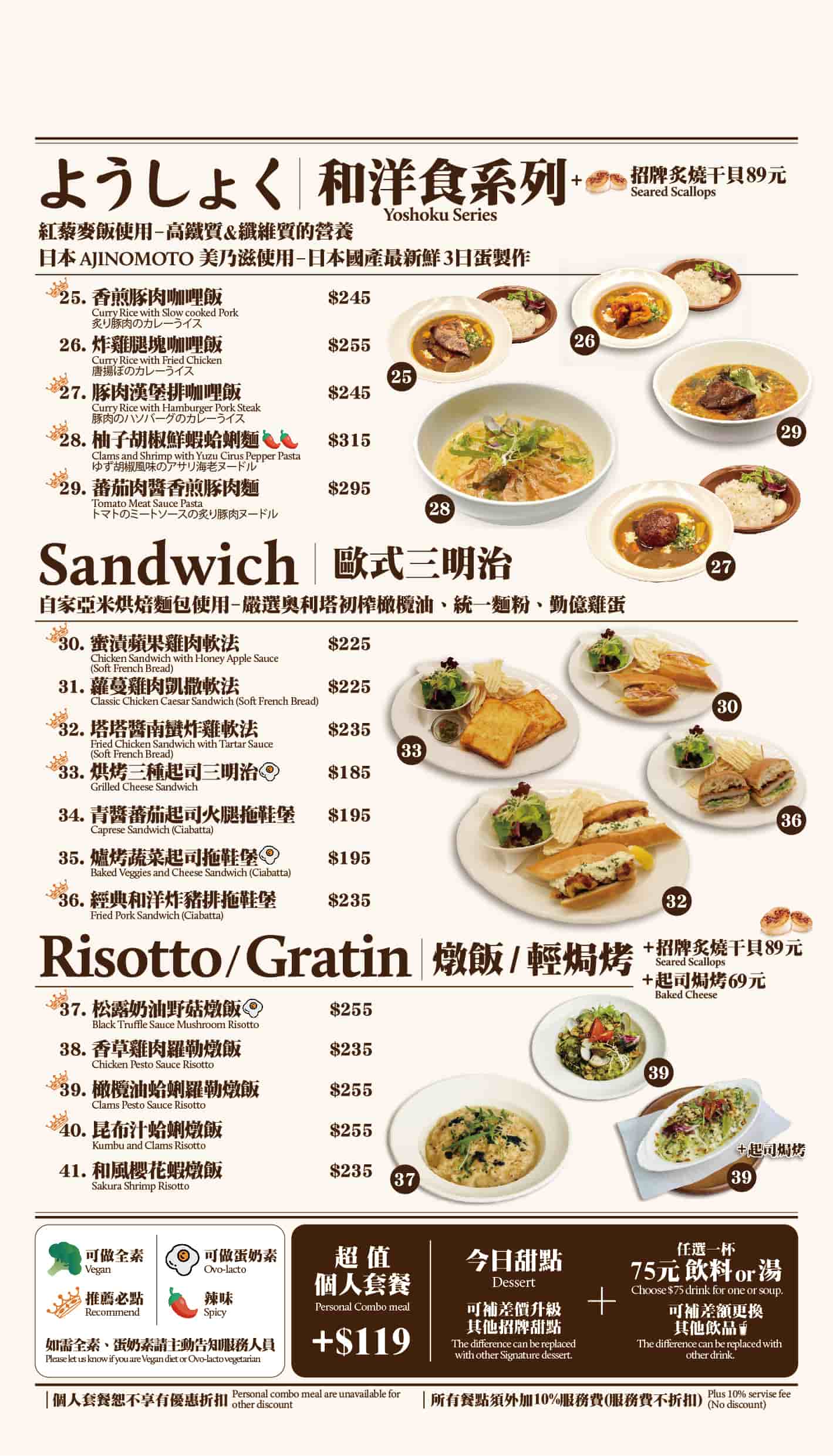 希拉餐廳的選擇很多~從開胃前菜、麵包、披薩、義大利麵、燉飯,到手作甜點、飲料等等,不管是一個人來用餐或是2人以上都很適合,也有不少餐點可以做成全素、蛋奶素,滿足不同口味!