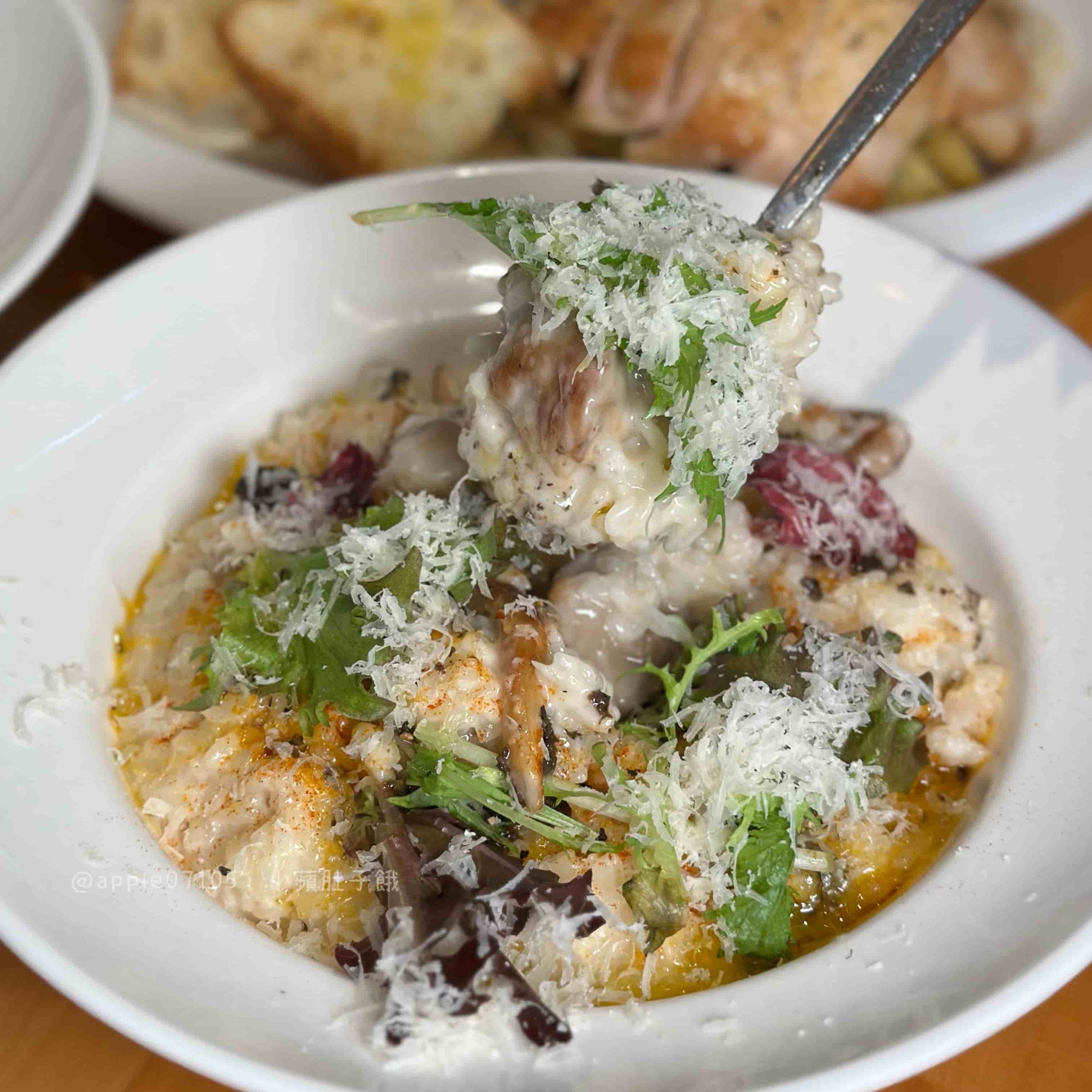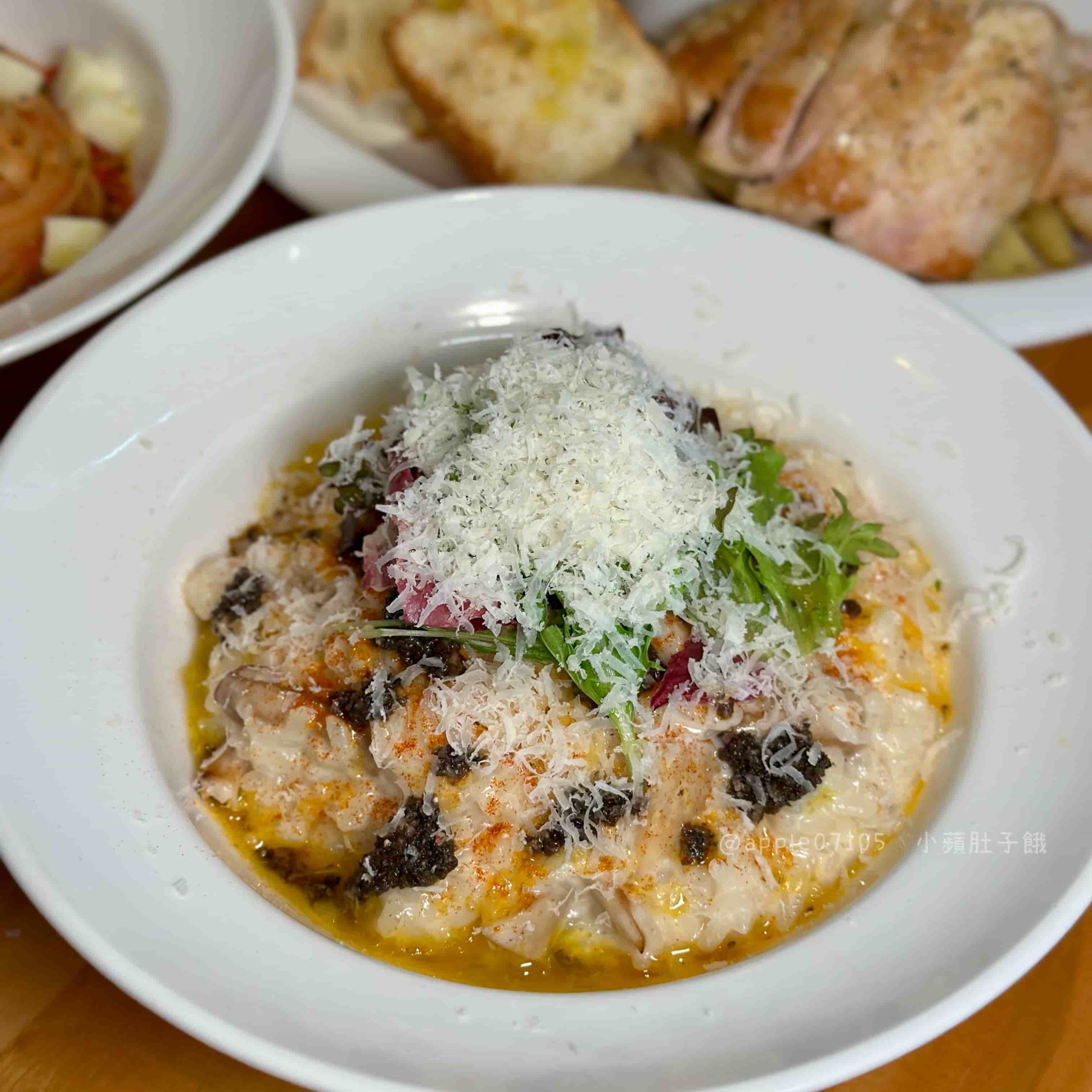 吃起來有濃郁奶油香氣與松露醬完美融合~香氣厚實又滑順,燉飯米粒偏軟,醬汁都有吸附進去,每一口都很濃郁,裡面的菇類種類多,脆口又帶汁,上層還有現刨的起司增加奶香、鹹香,邊吃還有感覺到胡椒辛香,讓整體濃郁卻不會膩~好吃