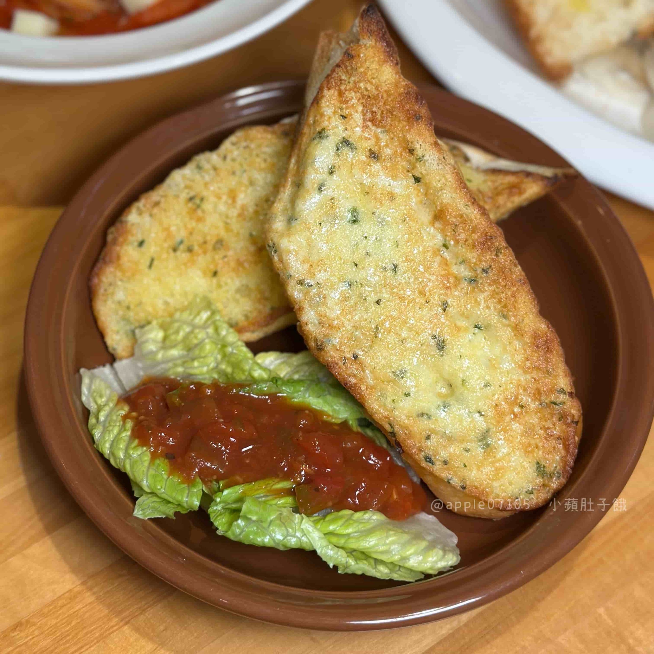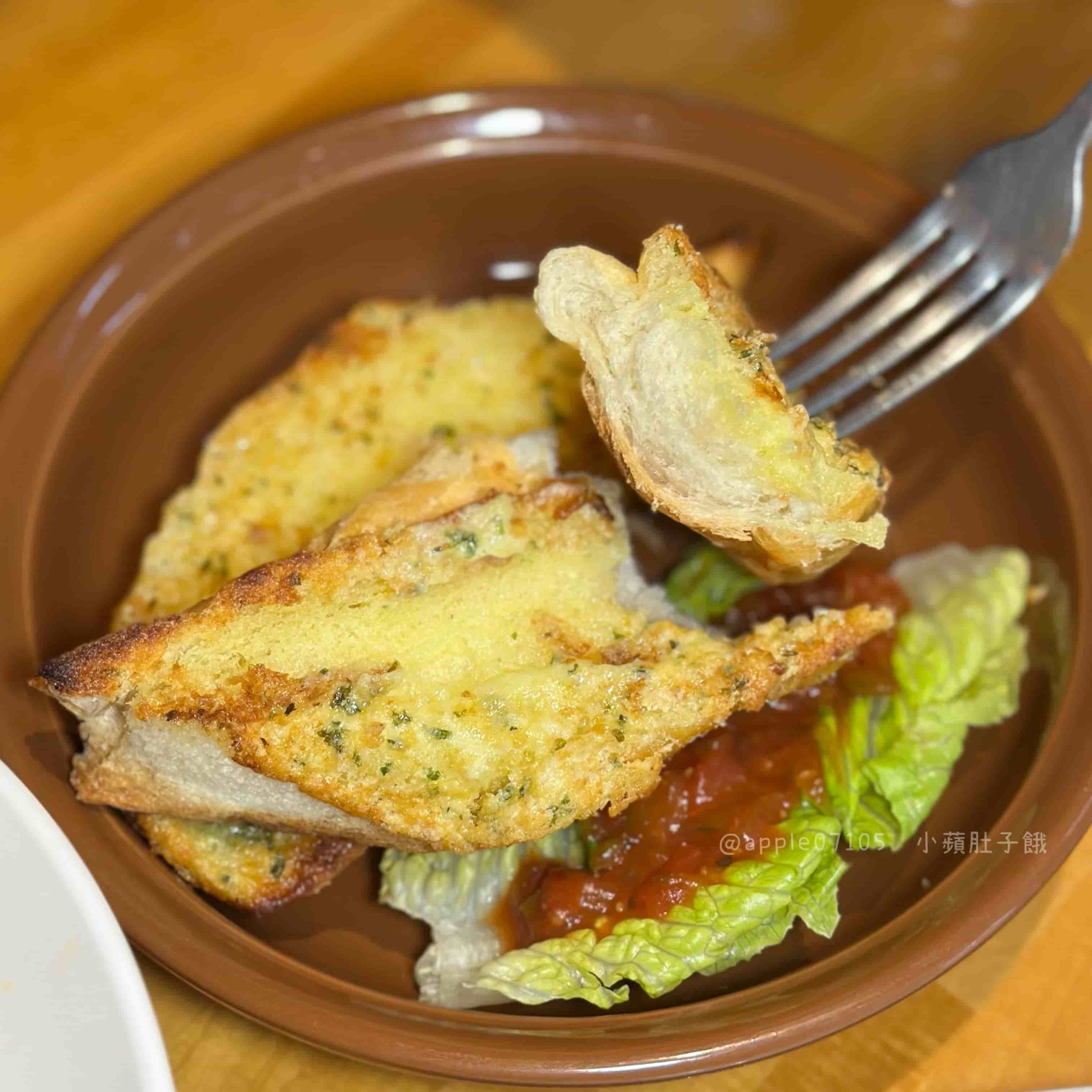 香蒜奶油烤軟法,吃起來蒜香濃郁又有奶香感,鹹中帶一點微甜,吃起來不會膩,軟法麵包也是外層酥酥的、裡面鬆軟,口感很剛好~旁邊搭配莎莎醬跟蘿蔓是蠻意外的組合,吃完軟法後再吃個莎莎醬蘿蔓是完全不同的香氣,酸酸辣辣又有脆口蔬菜感,很像是解膩的小配菜感覺