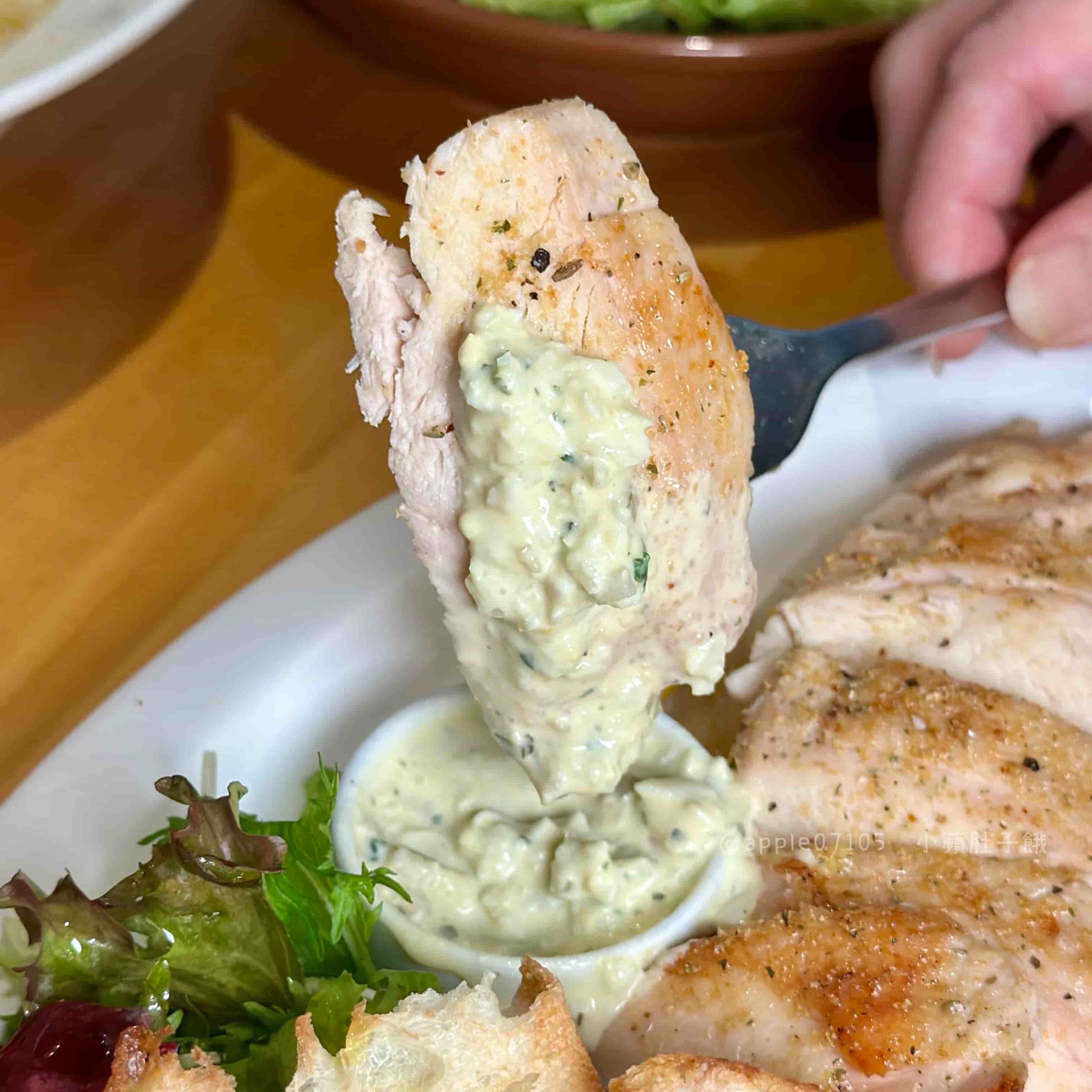 旁邊附的醬是感覺是那種濃郁的蛋黃奶醬,帶有濃郁洋蔥的甘甜香氣,沾著雞胸肉一起吃更滑順