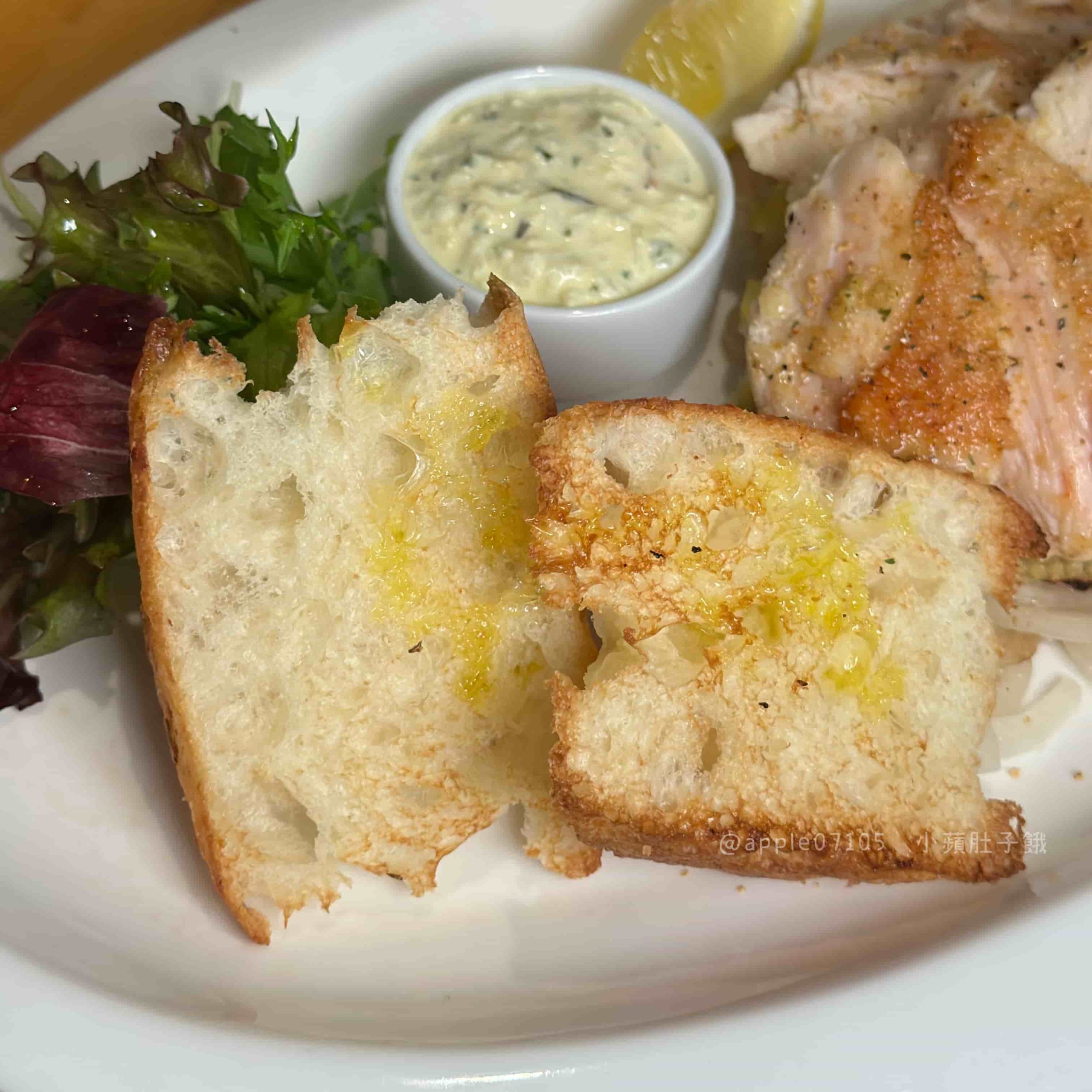搭配的麵包我好喜歡~每次吃他們家的麵包都覺得很驚艷,外層微酥、咬起來香氣很夠,越嚼越香的單吃不用配什麼就很好吃的那種!搭配著新鮮生菜和煎烤過的蔬菜,整體吃起來清爽不膩